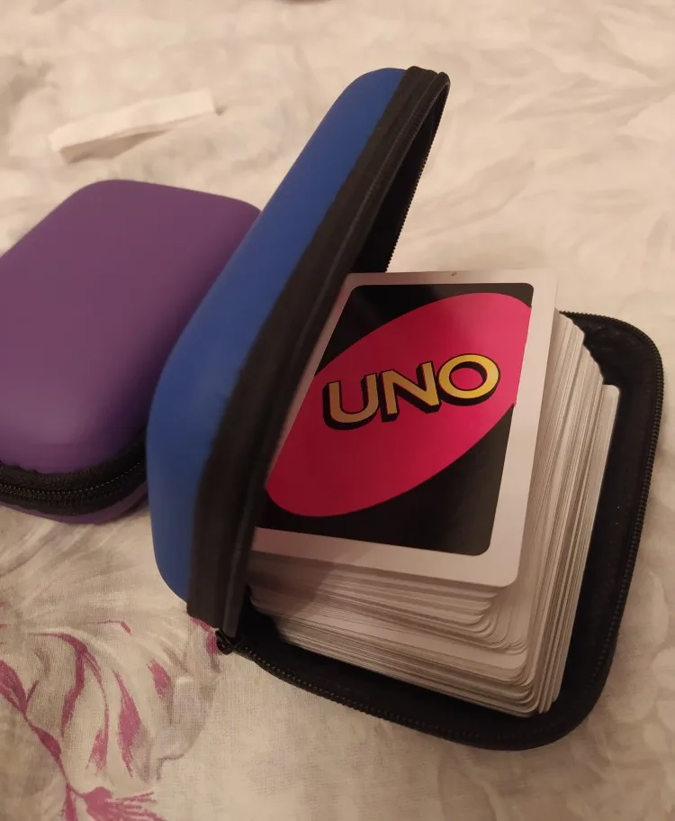 Чехлы красивые, прислали розовый и фиолетовый, цвет был на усмотрение продавца. Игра УНО помещается отлично, но замки ужасные, расходятся при застегивании. Расстроена.
