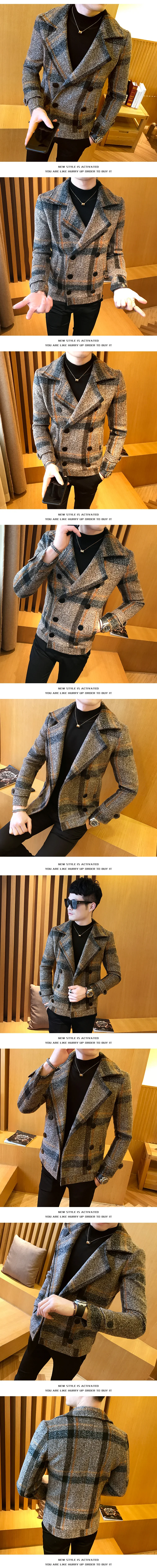 Мужской двубортный Тренч в стиле ретро, короткая приталенная шерстяная куртка в клетку, Осень-зима 2019