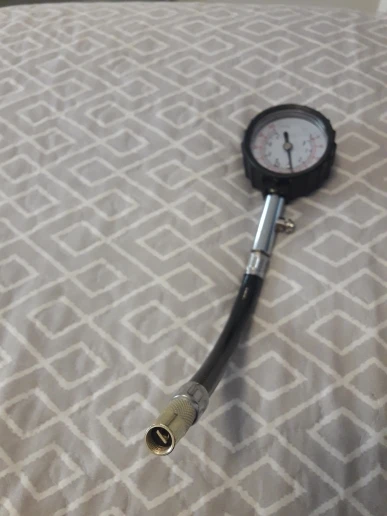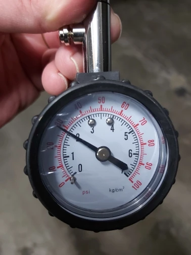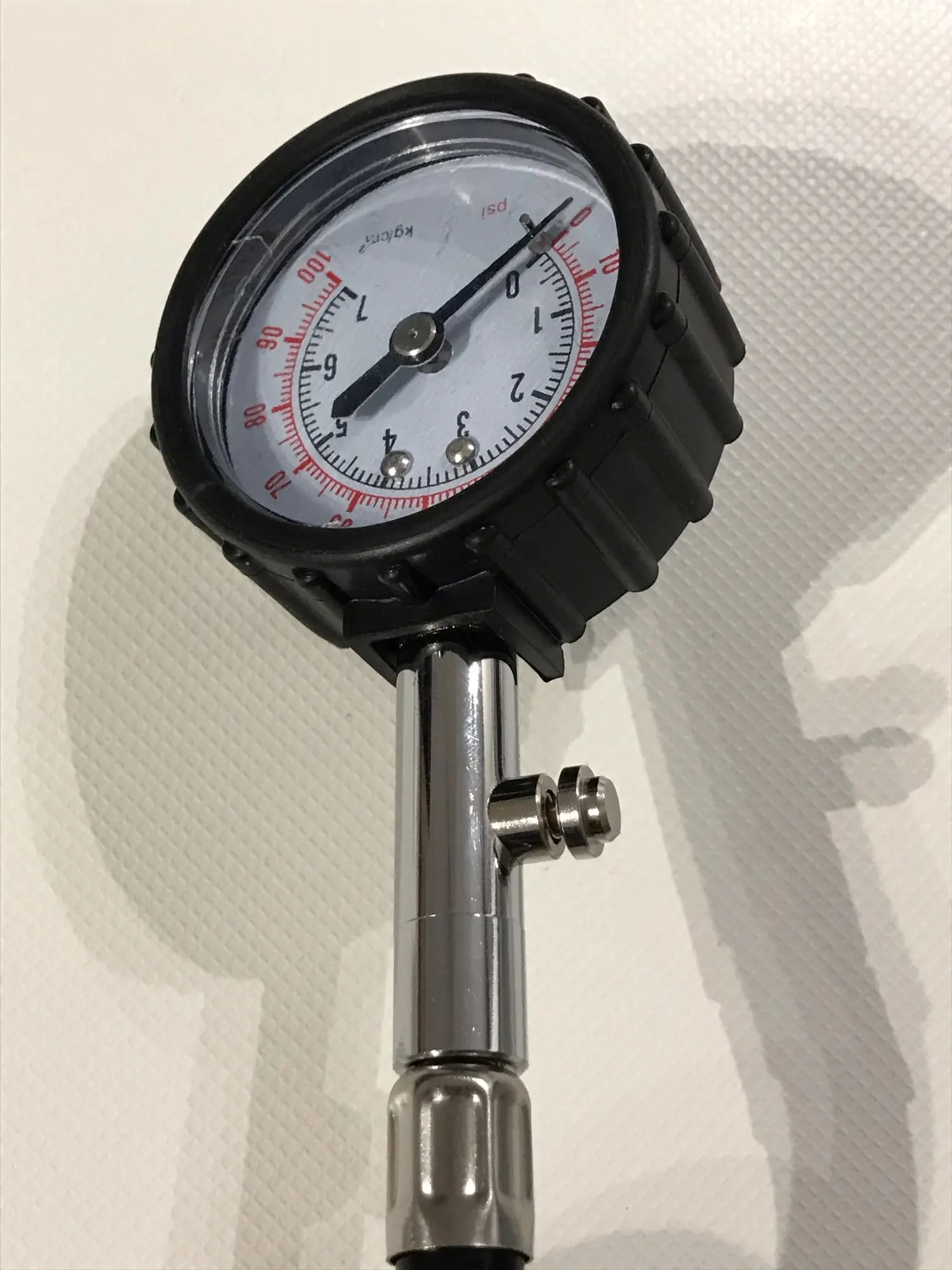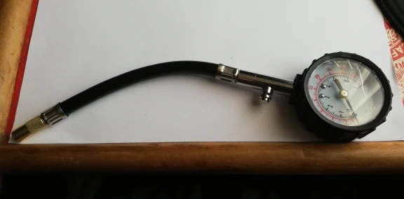 хороший товар. работает. меряет точно. показания фиксируются, пока не нажмёшь на кнопку сброса. есть небольшое заедание при вращении наконечника при накручивании его на ниппель (видимо заусенец внутри), но это некритично, работе не мешает.