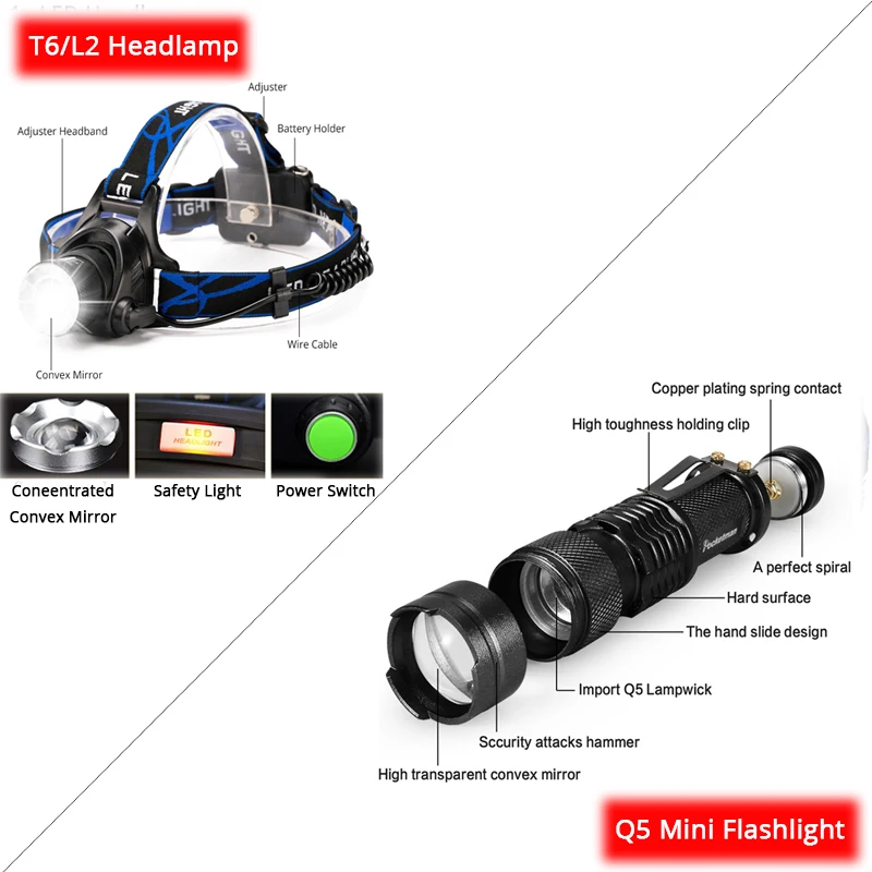 Фара T6/L2: * Бренд: Pocketman * Модель светодиодный: T6/L2 * Люмен: 6000/8000 люмен • Водонепроницаемая конструкция * Корпус из алюминиевого сплава * Отражатель из алюминиевого сплава * 3 режима переключения: яркий светильник/тусклый светильник/мигающий режим * Требуемая модель аккумулятора: 2 аккумулятора 18650 (не входят в комплект) * Цвет: черный с синей лентой * Головной светильник Вес: 175 г * Регулируемый фокус, масштабируемый светодиодный налобный фонарь * Переключатель: нажимной выключатель