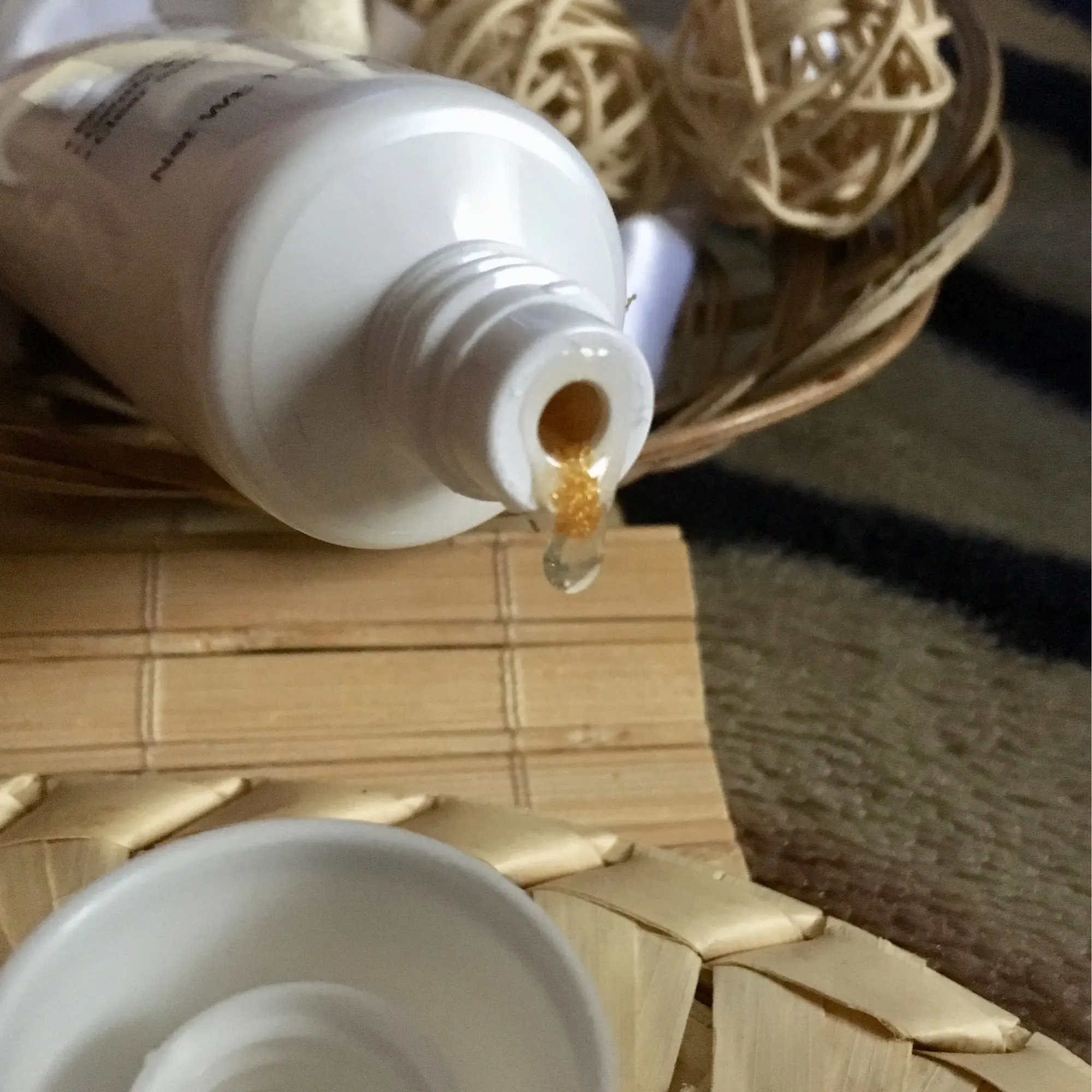 Маска пришла в бело-розовой брендовой коробке, запаянной в слюду, при этом на самой коробке я нашла всю необходимую информацию, такую как сроки годности, состав и краткая информация о производителе. Вскрыв коробку я вытащила беленький тюбик 40 грамм, приличный объём для маски-пленки. Хватит надолго с тем учетом, что такие маски делать надо не чаще 2-3 раз в неделю! Сверху закручивающаяся крышка, под ней фольгированная пломба. Цвет у маски золотой.Консистенция тягучая, наносить удобнее с помощью специальной кисти для масок!