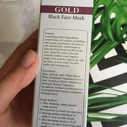 Маска Содержит золотые частицы, так же напитана различными питательными и косметическими ингредиентами, крем мягкий и деликатный, помогает очистить черные точки и лишнюю грязь в порах и убрать косметические остатки, улучшает шероховатость. Помогает стать коже нежной и прозрачной.
