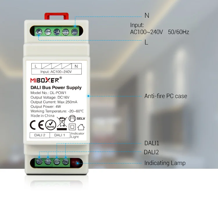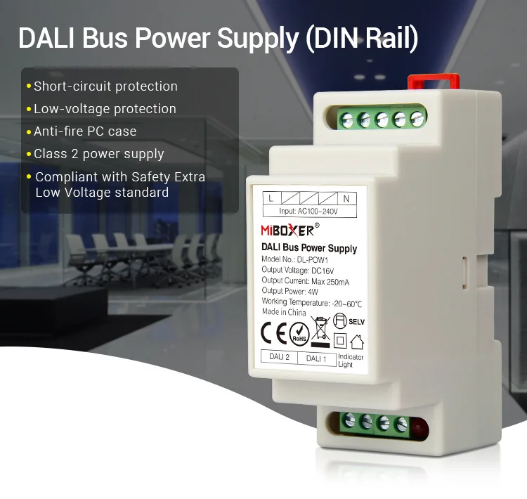 Название продукта: DALI Bus Power Supply (din-рейка)Номер модели: DL-POW1Вход Напряжение: AC100 ~ 240V 50/60HzВходной ток: 115Vac/≤ 0,09a, 230Vac/≤ 0,05aТок утечки: <0.5 мА/230 В переменного токаПусковой ток: Холодный старт 10 А при 230 В переменного токаВремя установки: 115 В переменного тока <2500 мс, 230 В переменного тока <1500 мс (при полной нагрузке)Выходное напряжение: DC16VВыходной ток: 250 мА максМаксимальная номинальная мощность: 4 ВтПульсация и шум: 0.2Vp-p (при полной нагрузке)Рабочая температура. : -20 ~ 60 °CРабочая влажность: 20 ~ 95% RH, без конденсацииБезопасность и EMCСопротивление изоляции: I/P-O/P: 100M Ω/500VDC/25 ℃/70% RH