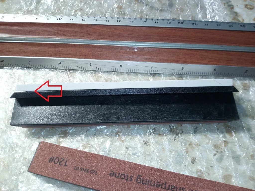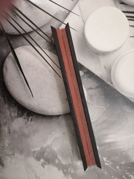 Размеры: 2 см в ширину, 16 см в длину. При доставке запакован очень хорошо. Белая часть относительно быстро темнеет при заточке. Затачивать впринципе удобно.