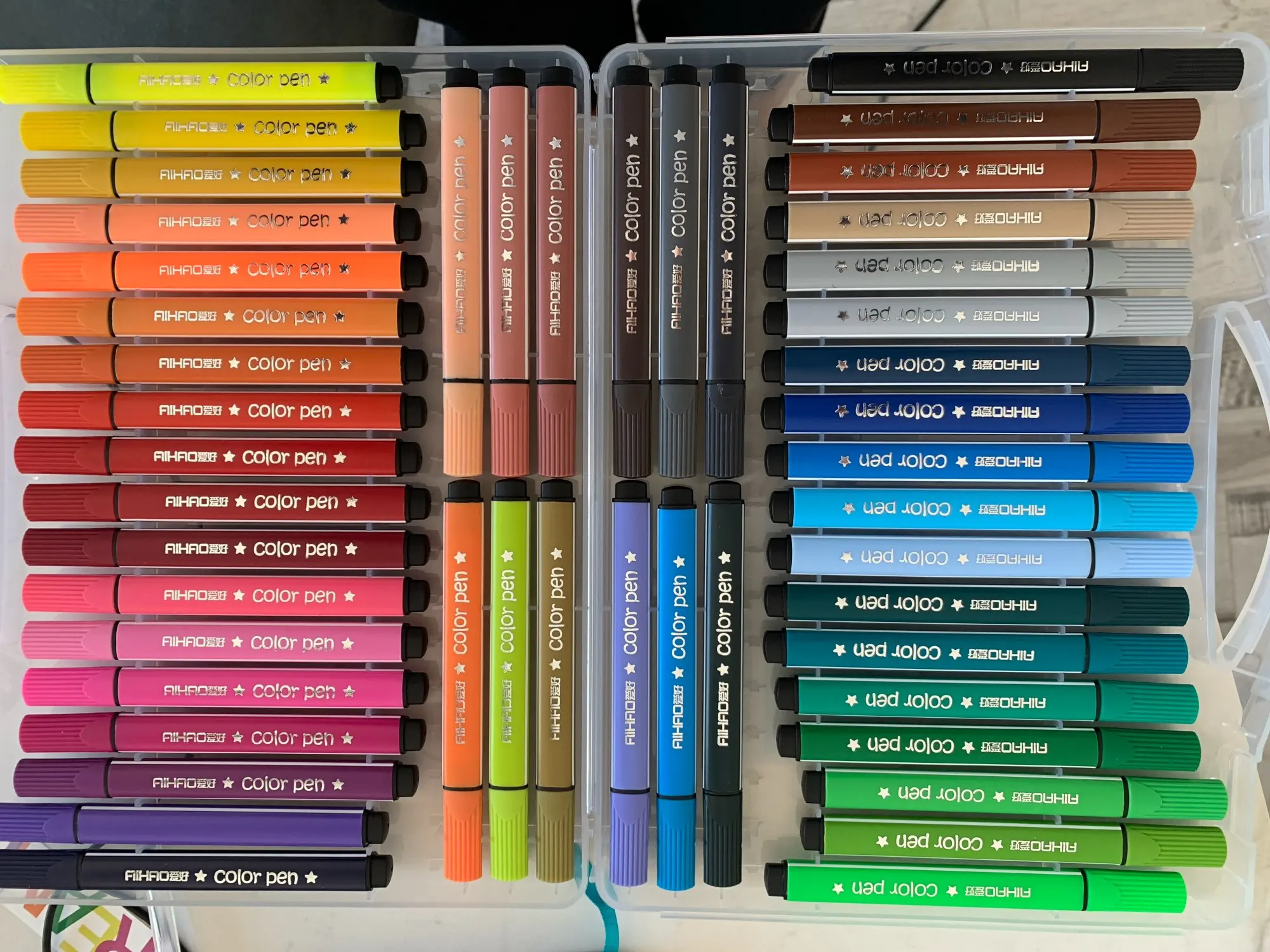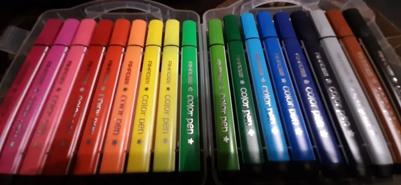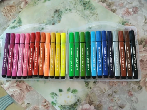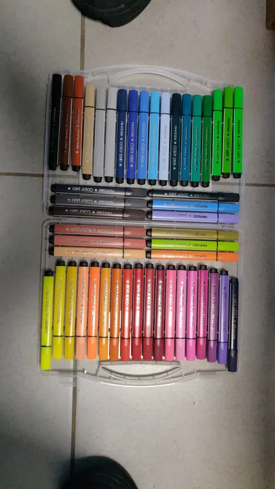 Это очень хорошая коробка, очень полная. Некоторые цвета выглядят лучше, чем другие. И флуоресцентный оранжевый не флуоресцентный, а обычный оранжевый. Желтый течет, однако. Последние два бордовых оттенка идентичны, за исключением того, что он имеет более однородный рендеринг, чем другой. Я не проверял все, но это остается очень правильным. Хорошая ручка, предложенная в подарок.