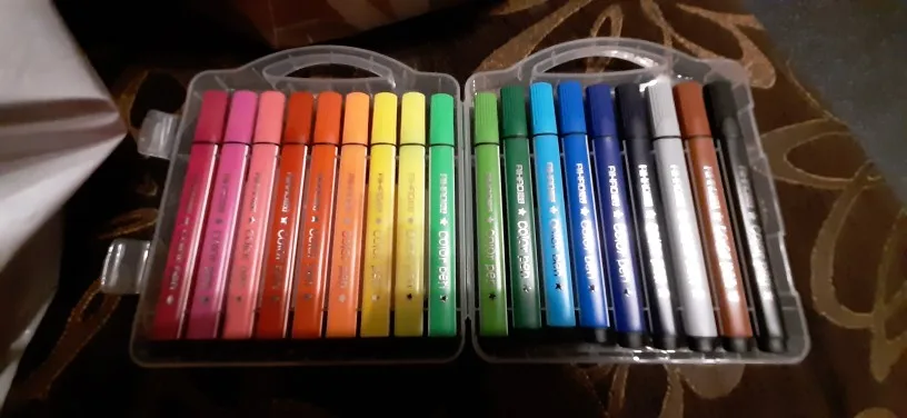 Фломастеры получены в прекрасном состоянии, упакованы были в пупырчатую пленку , так что коробка не пострадала , пишут отлично , надеюсь прослужат надолго , в подарок продавец положил ручку , можно легко менять стержень когда закончатся чернила . Спасибо ))