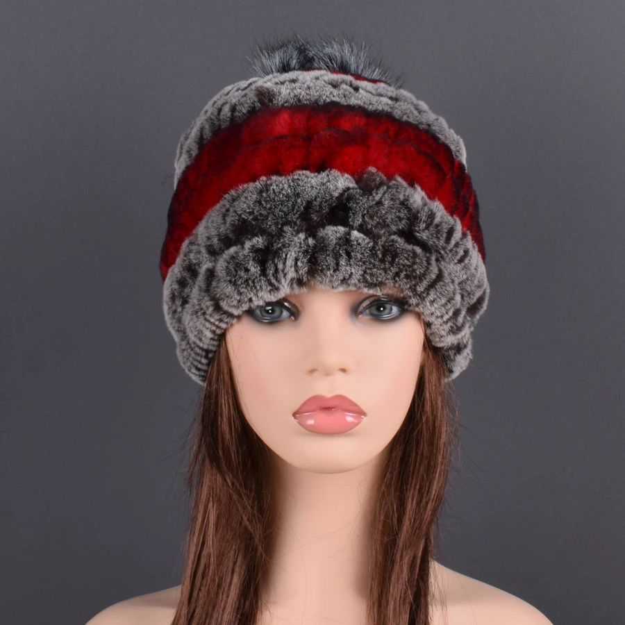 Женская зимняя трикотажная шапка-бомбер с помпоном из натурального меха