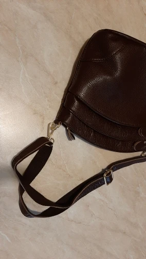 сумка небольшая, но довольно вместительная за счет 5 карманов помимо основного отделения. вроде кожа, но тактильно напоминает эко кожу. ремень сшит из кусков (за это сняла звезду), заложенных на платный ремень их хлопковые нитей (нескользкий, что может смущать поначалу, но это гораздо удобнее в носке, так как сумка не скатывается, если наклоняется или открываешь её назад) подкладка шуршит ,зато держит форму, что лично мне больше нравится.