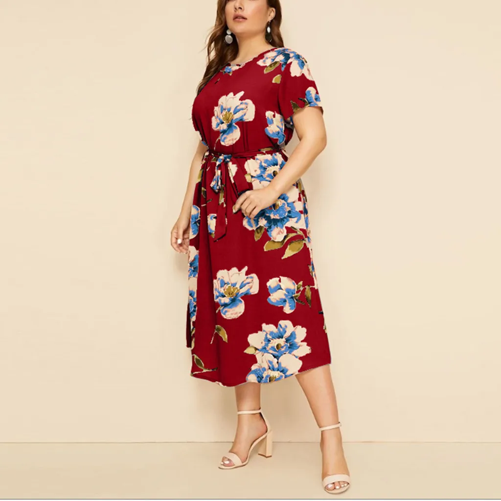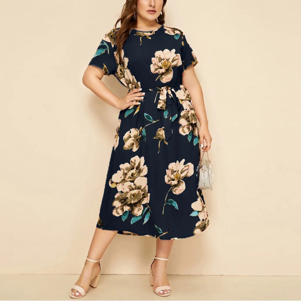 Женское Богемное платье макси, Богемное платье-рубашка с круглым вырезом и коротким рукавом, с цветочным принтом на талии, Богемное платье, лето L-5XL