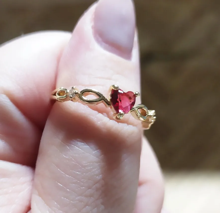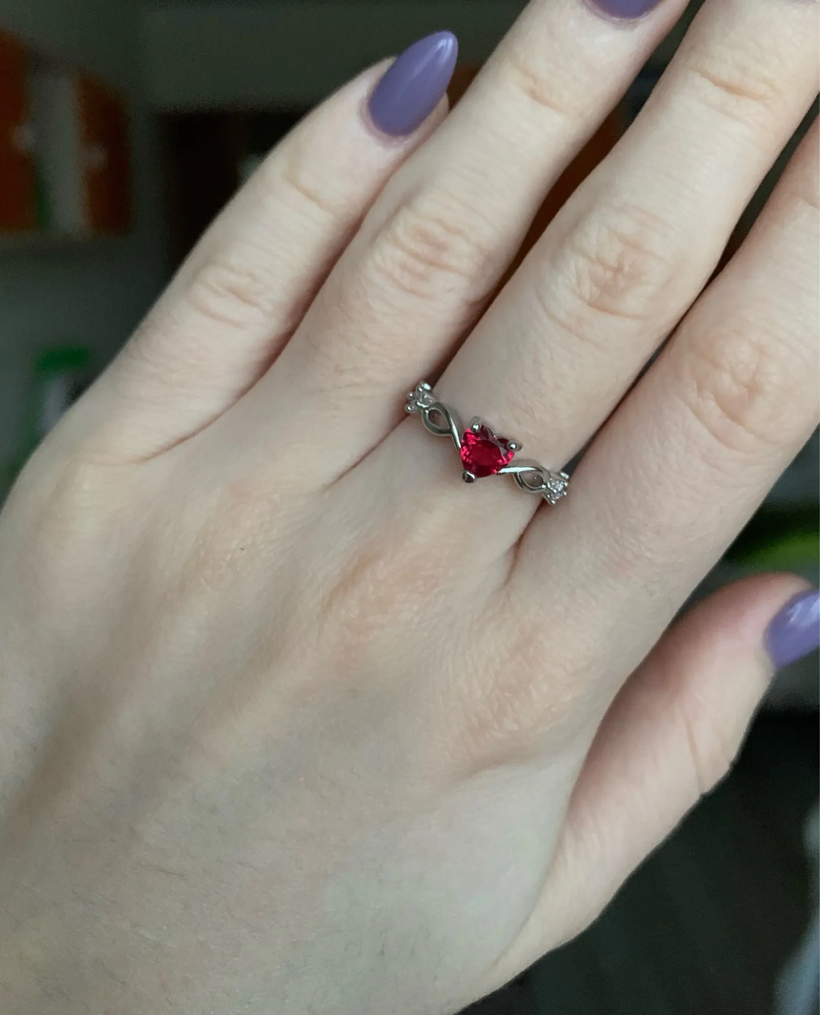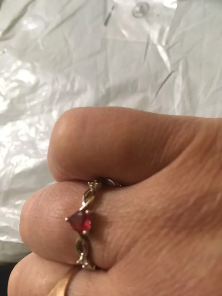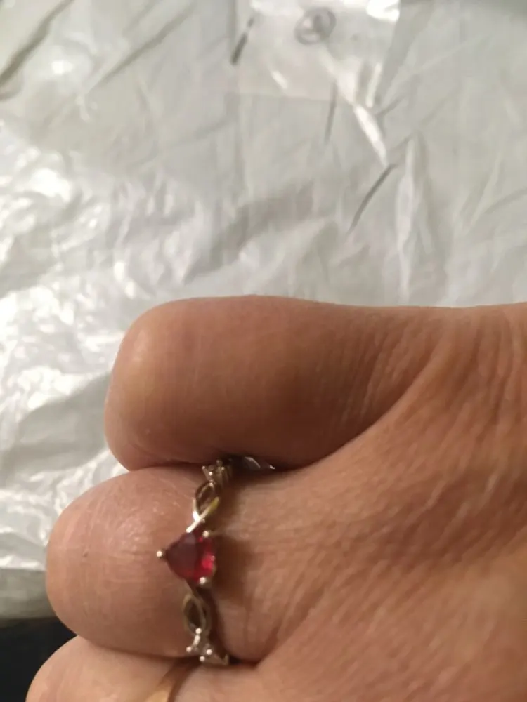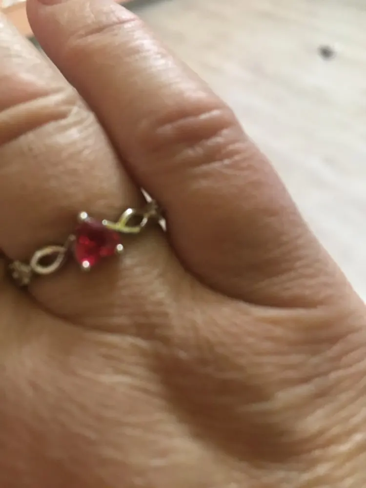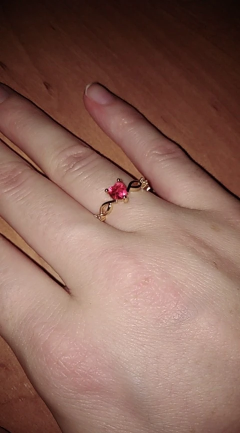 Кольцо красивое. На 15-15,5 заказала 5 размер, все отлично подошло. Камушек имеет яркий, насыщенный красный цвет, минус - похож на обычную стеклышку (но он и является стекляшкой, поэтому не стоит ожидать большего). Элементы по краям кольца не очень приятно ощущаются соседними пальцами, но терпимо. Металл похож на серебро, среди настоящих серебряных колец никак себя не выдаёт. Доставка быстрая - 2,5 недели. Рекомендую!