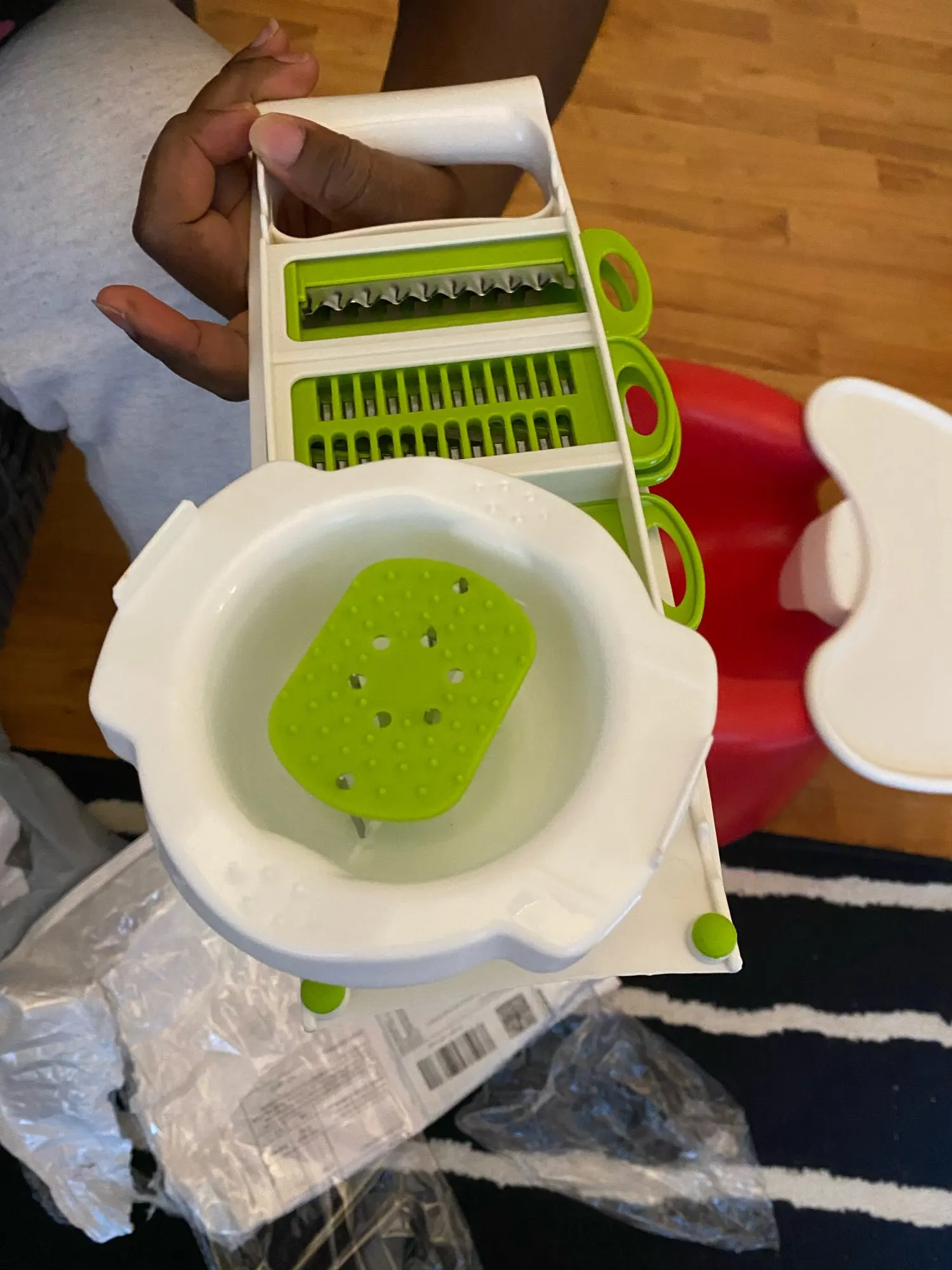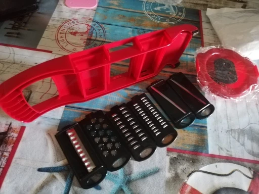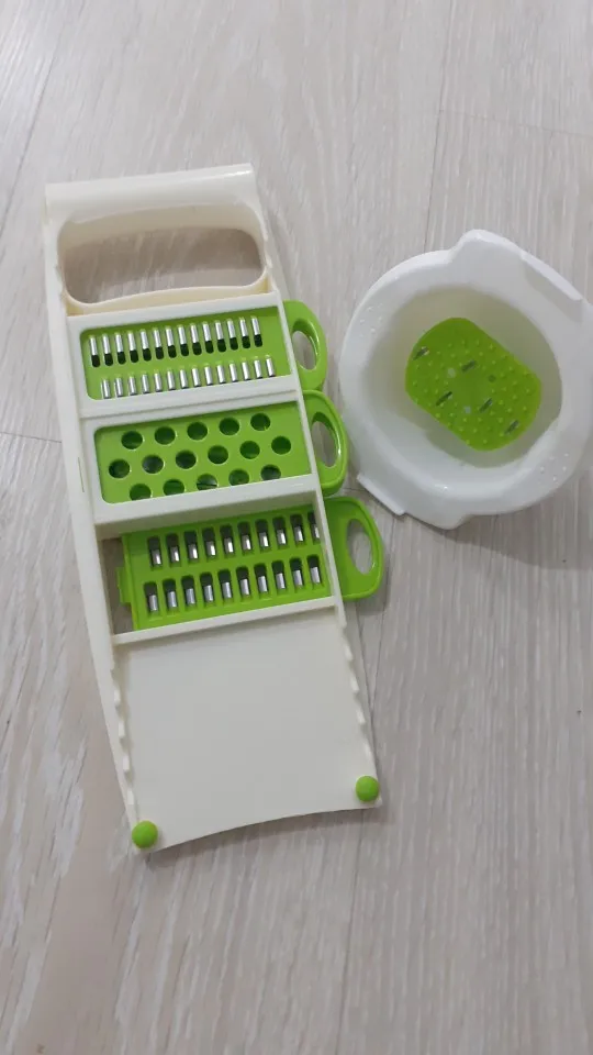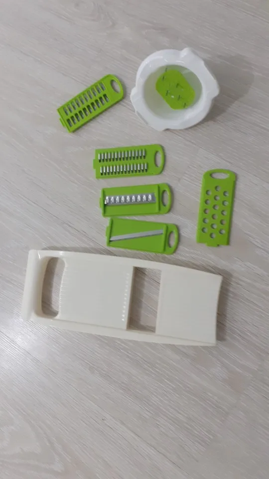 Терку получила один в один как на фото. Быстрая доставка. Попробовала в деле: сменные лезвия не фиксируются в пластиковой пластине, поэтому, когда натираю ту же морковку, зелёную секцию периодически приходится на место ставить. А сибирскую картошку так вообще не получилось нашинковать фигурно. Обычный резак за 150₽ лучше справляется. В общем, агрегат для мягких или отварных овощей-фруктов. За такие деньги почти не расстроилась. Пойдёт.