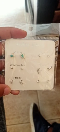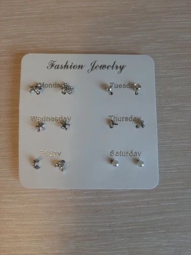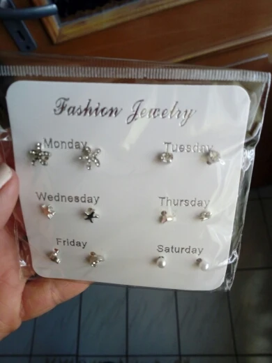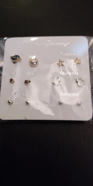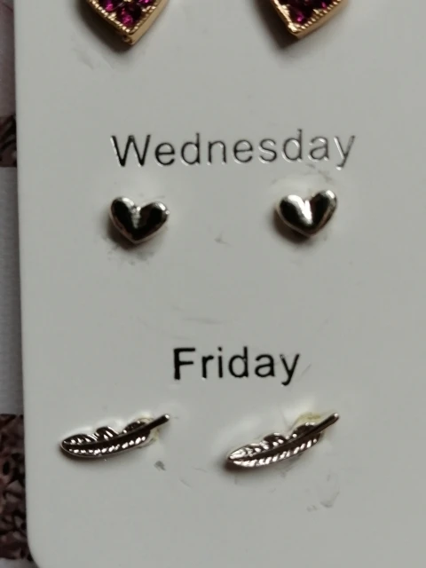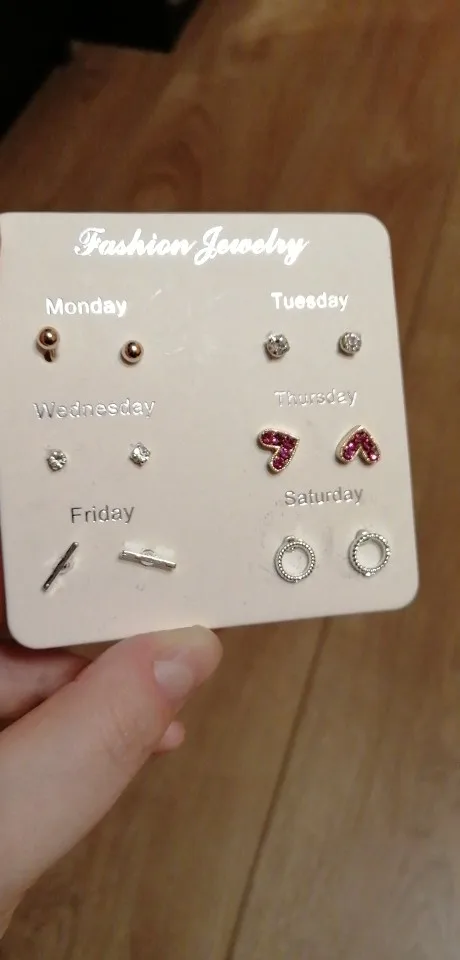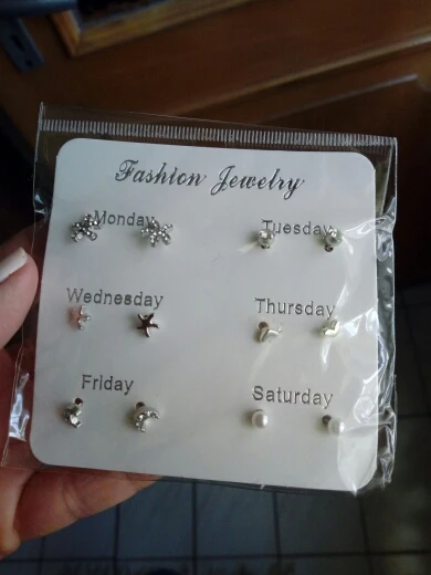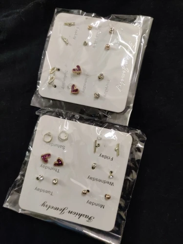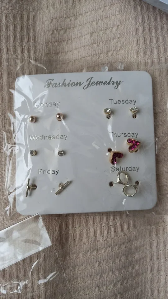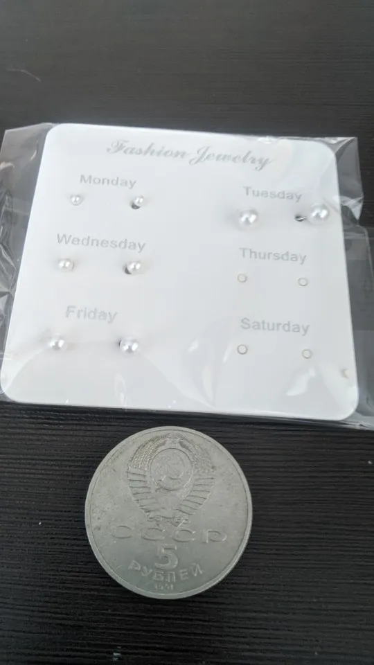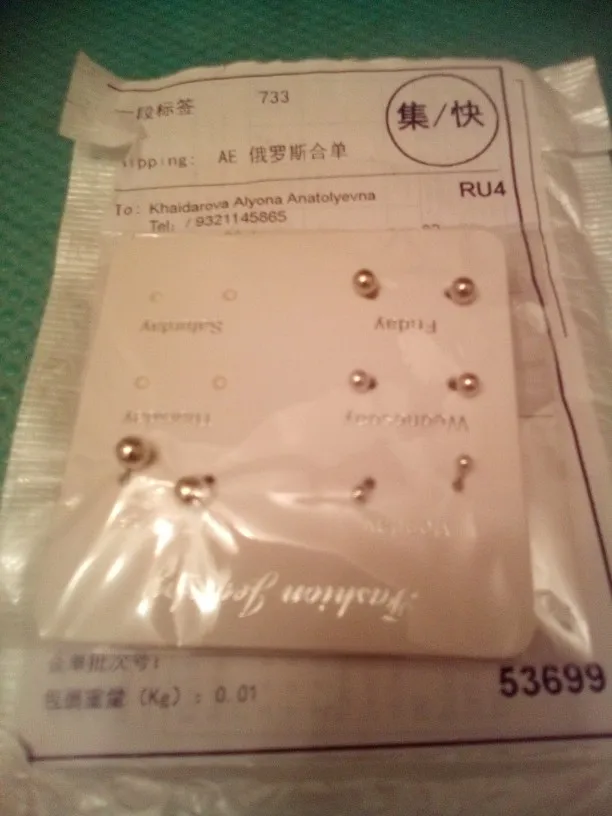 Заказ был сделан с огромной скидкой по купону продавца и отправлен через неделю. Набор серёжек пришёл почему-то золотого цвета, а не серебряного. Видимо, со временем металл желтеет и мой комплект какое-то время лежал на складе. В остальном серьги такие же, как и в описании - маленькие и аккуратные, с хорошей детализацией. Мне понравилось, что все штифты были прямые, ничего не пришлось распрямлять. В комплекте пришли 4 дополнительных заглушки.