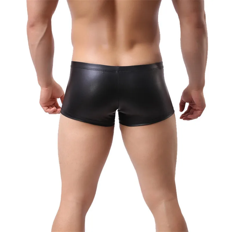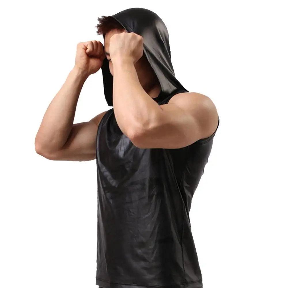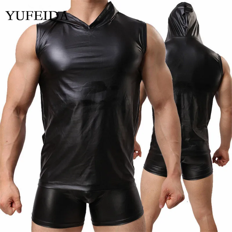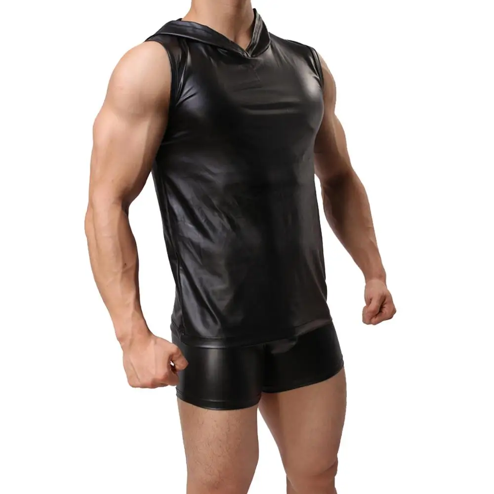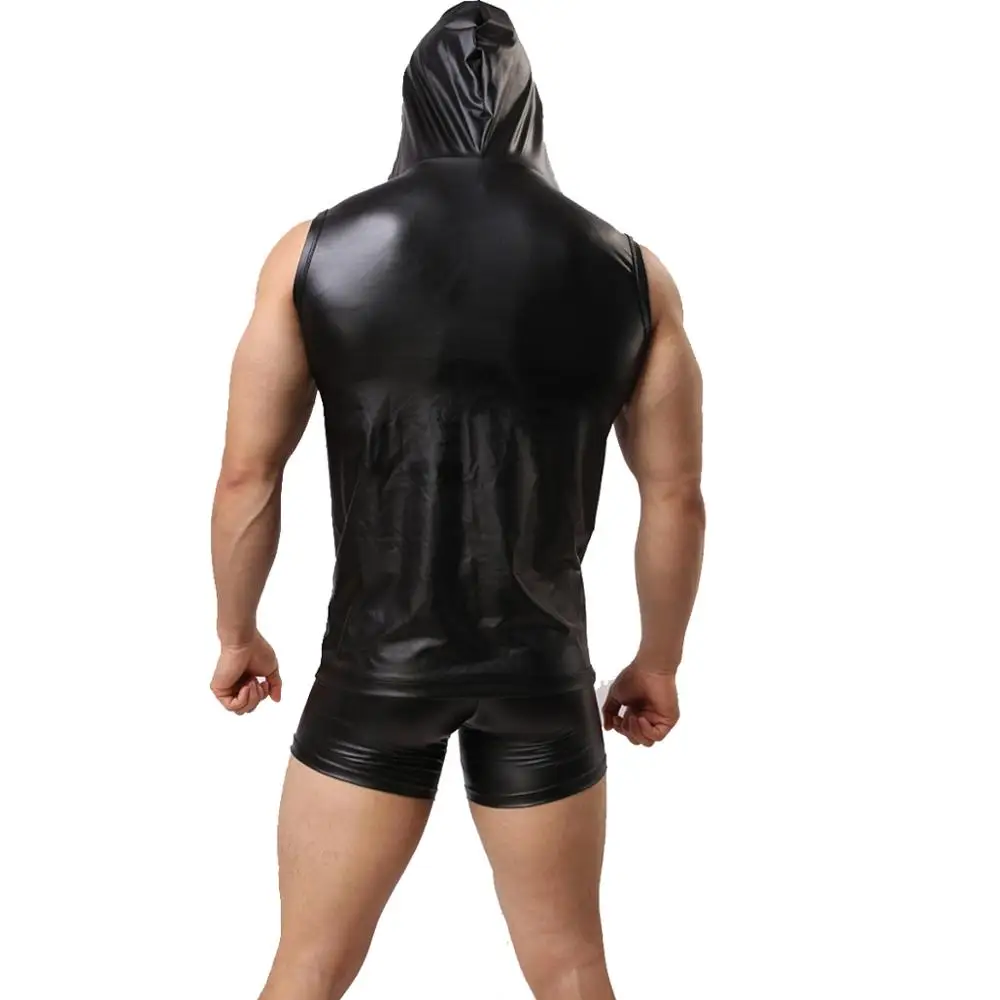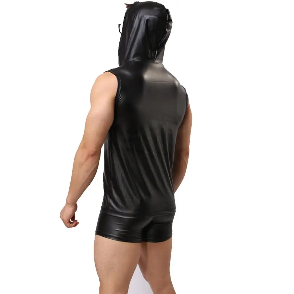 Мужская одежда, сексуальные мужские трусы из искусственной кожи, WetLook, без рукавов, жилет с капюшоном, топы, боксеры, шорты, нижнее белье для сцены, танцев, Клубная одежда, новинка