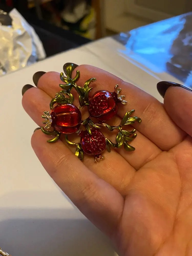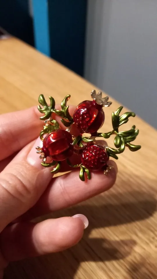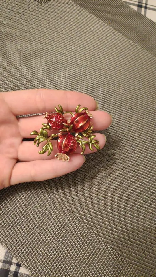 Брошка с гранатами совершенно не соответствует фото продавца. гранаты залиты густо красным лаком и если не знать, что это гранаты, то вообще не догадаешься, что за красные шары на брошке. НЕ понравилась. Доставка быстрая, здесь притензий к магазину нет.