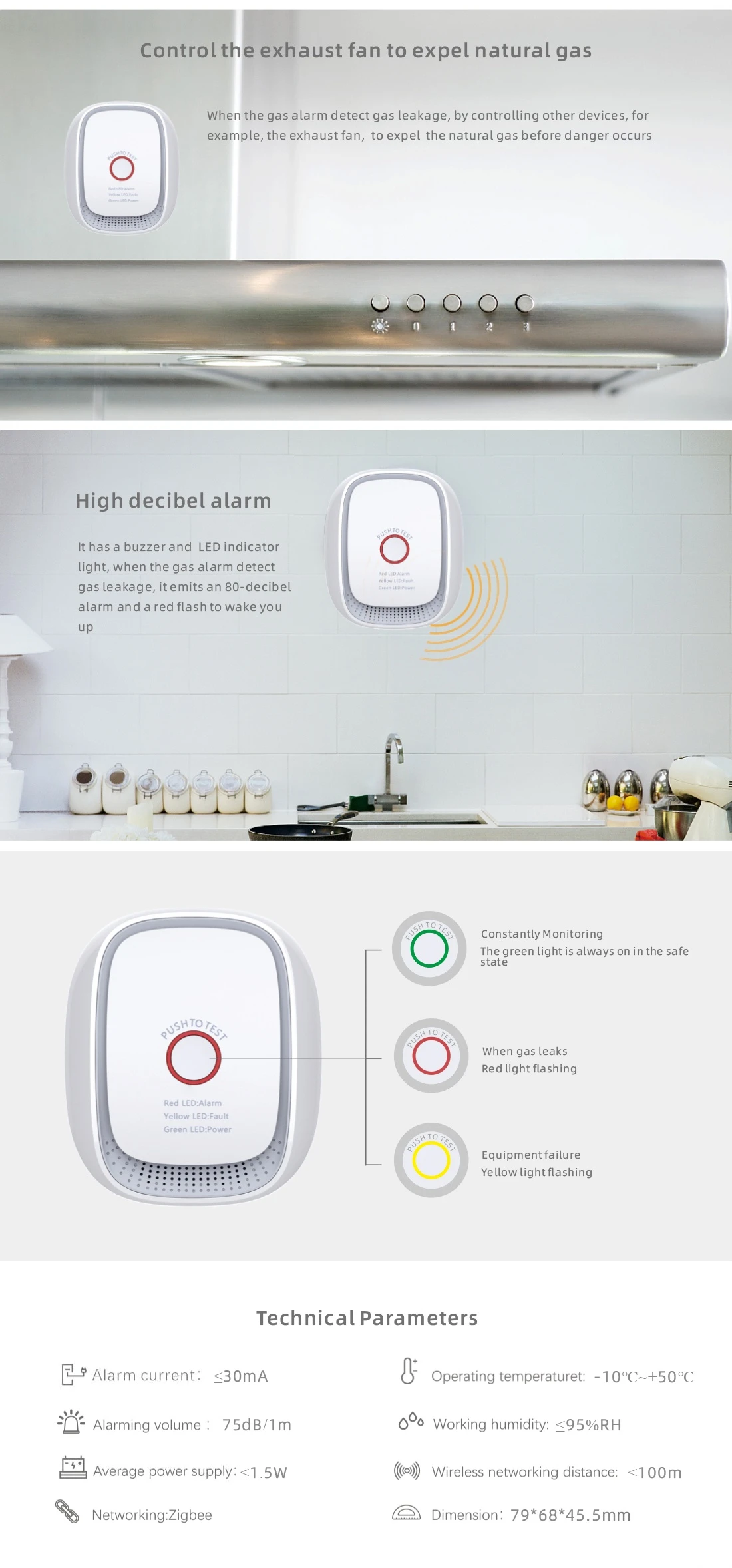 1.Этот детектор газа zigbee должен работать с Zigbee Hub/gateway. Тогда вы можете получить сигнал тревоги через приложение!