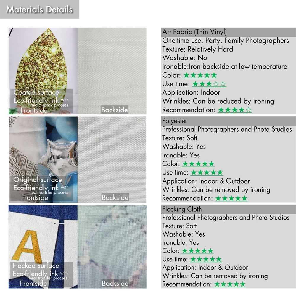 Не водонепроницаемый; Имеет меньшую складку,Может использоваться только для фотосъемки;Максимальная бесшовная ширина 300 см;Вы можете гладить его, чтобы удалить складки, складки могут быть улучшеныПодходит для использования в помещении, подходит для одноразового использования.