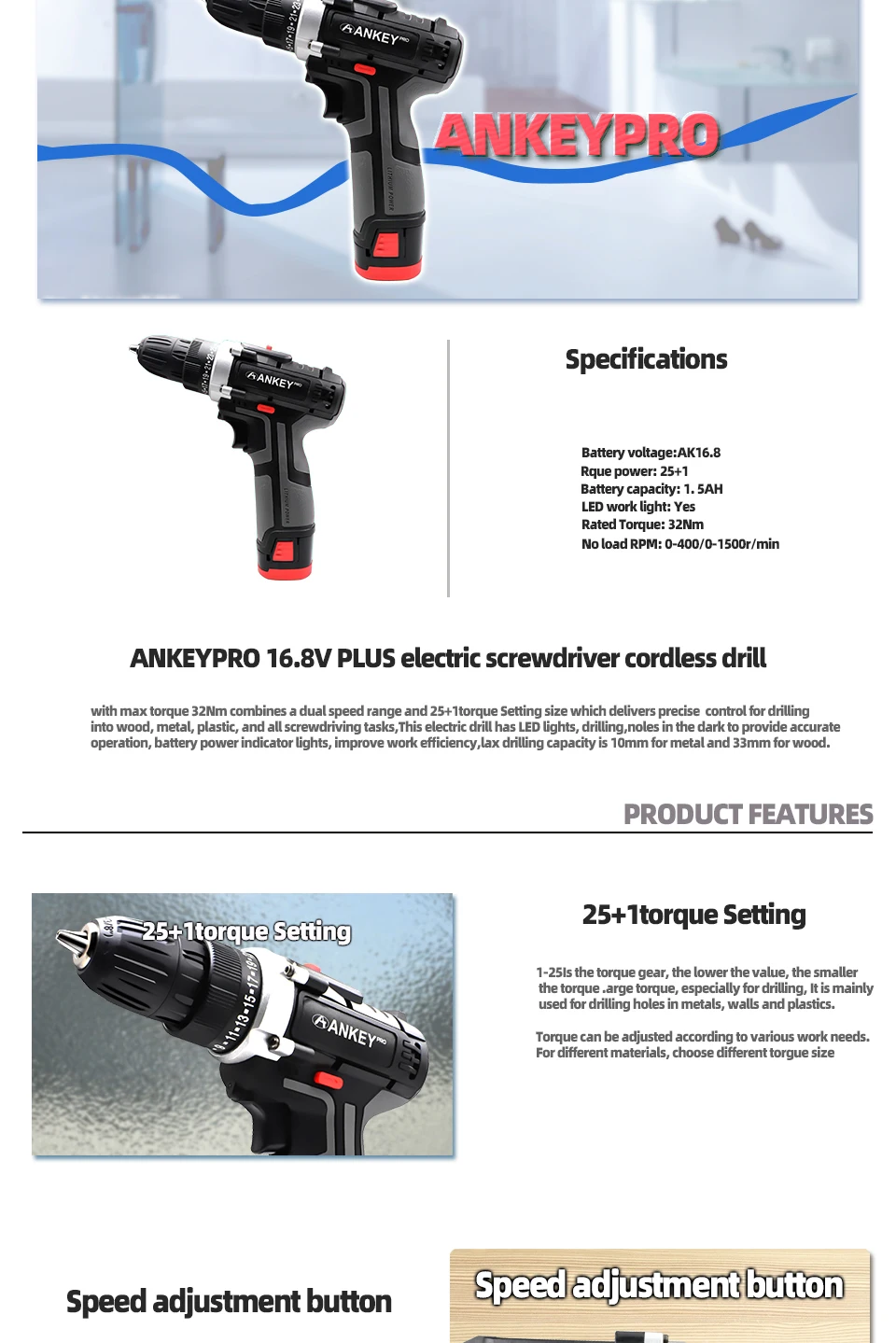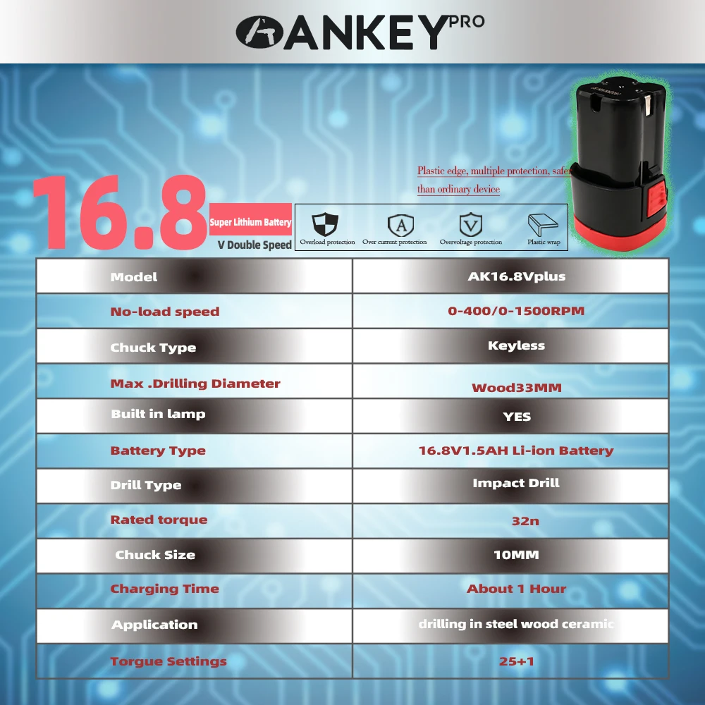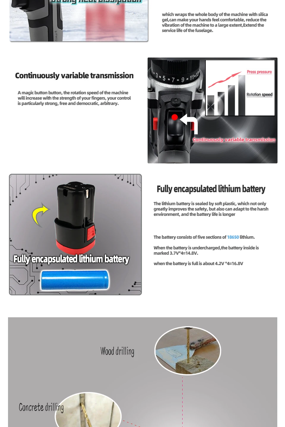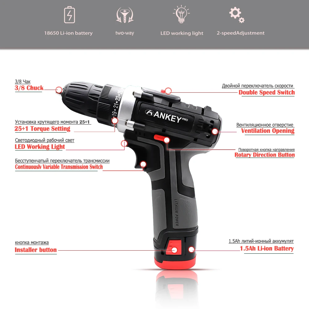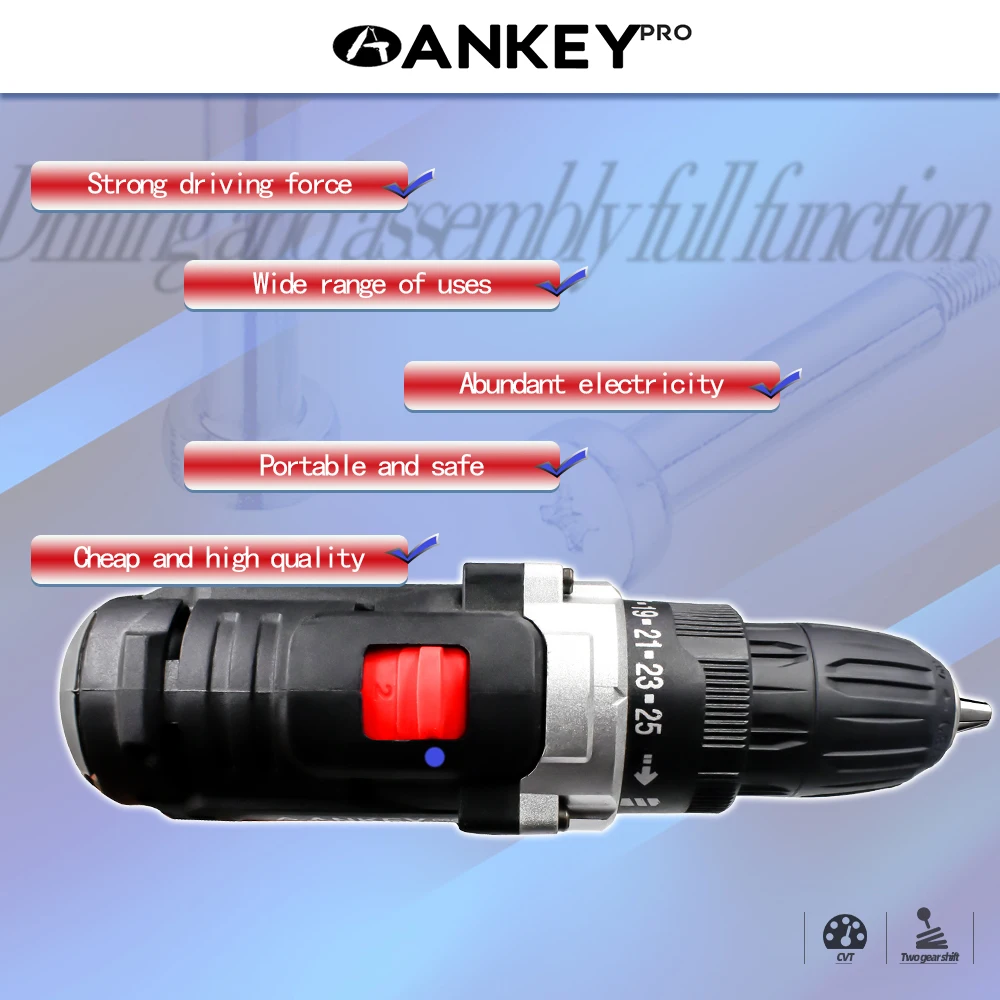 1. Реверсивный. Автоматическая конструкция картриджа.2. Бесступенчатая.3. Регулировка крутящего момента в 25 стойках.4. Водонепроницаемость, защита от падения и утечки.5.ECP: устройство защиты аккумулятора для предотвращения перегрузки, перегрева и глубокой разрядки аккумулятора.6. Встроенный светодиодный светильник для освещения рабочей зоны также может работать в ночное время.7. Скрученная Мягкая рукоятка для оператора CST обеспечивает отличный захват и ощущение комфорта.8. Регулировка регулятор скорости "быстро-медленно".