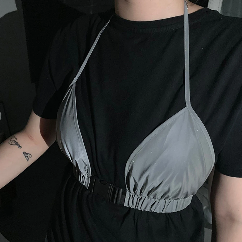 Новинка, Женский Светоотражающий Комплект из 2 предметов с юбкой, яркие светящиеся укороченные топы с пряжкой на шее, свободные шаровары, спортивный костюм