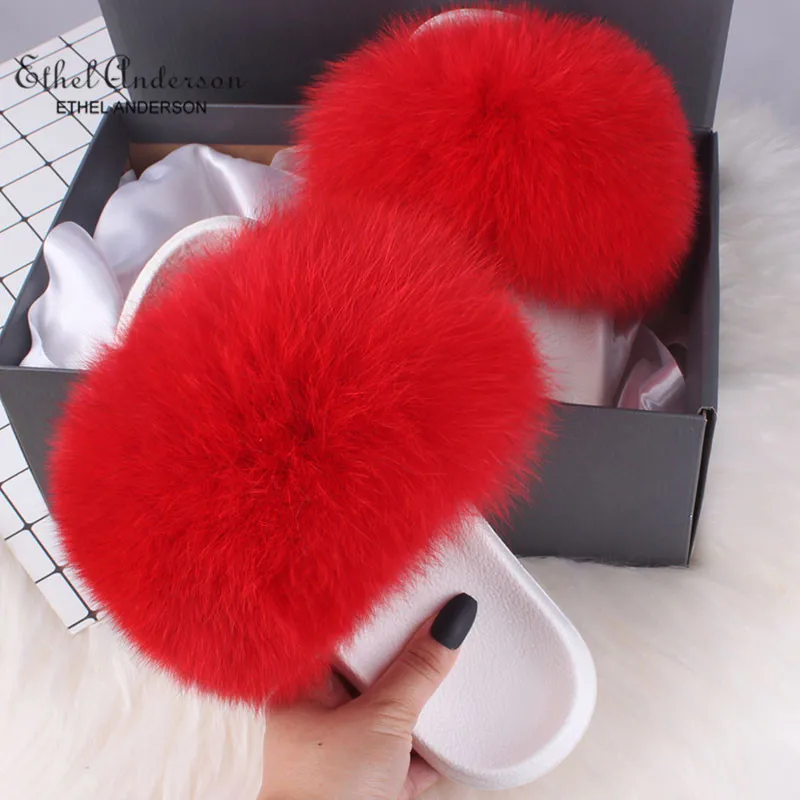 Шлепанцы женские с натуральным лисьим мехом енота, сланцы, пляжные ...