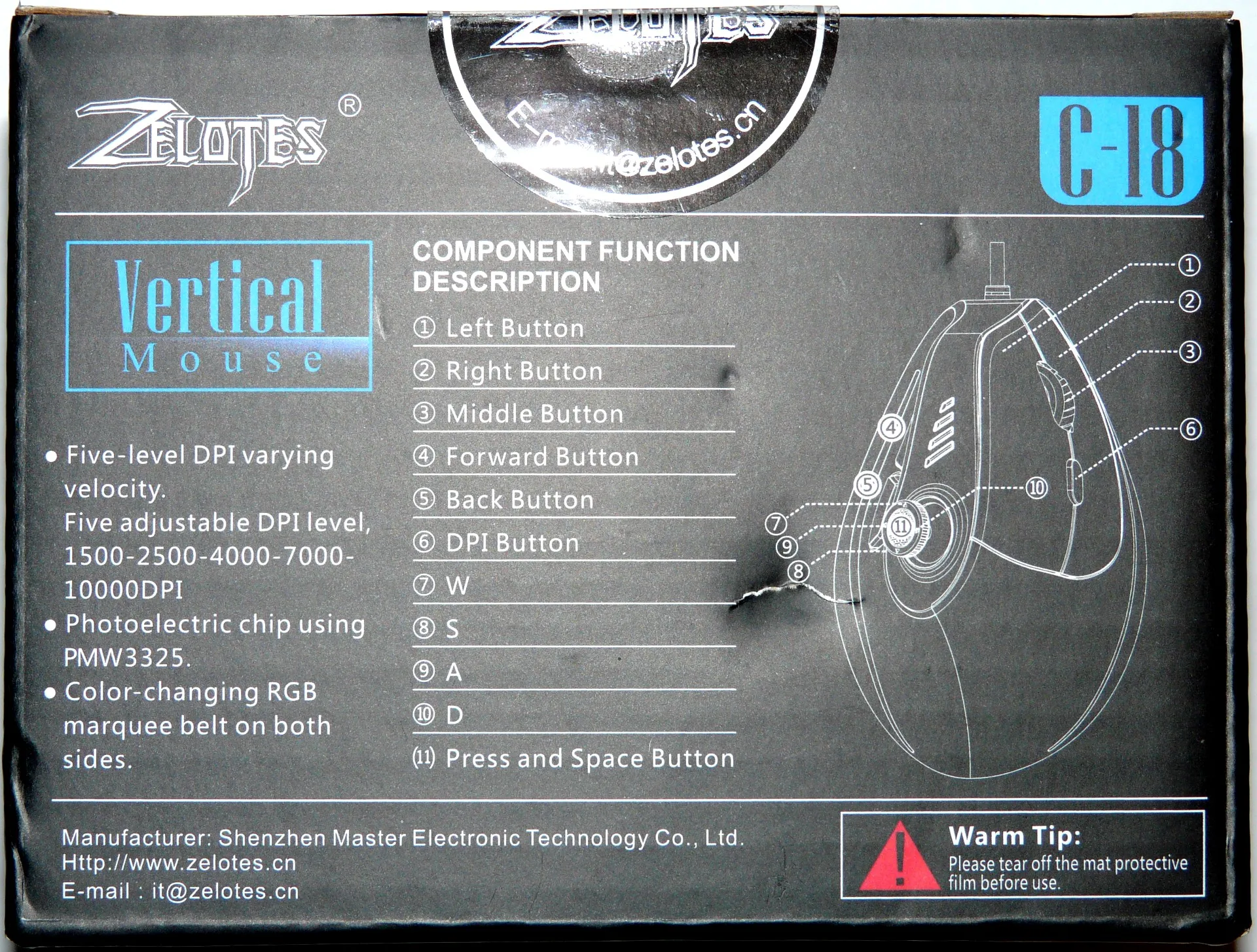 Моя первая Вертикальная мышь, очень довольна этим. Загрузите программное обеспечение Zelotes C-18 со своего сайта для получения последней версии. Программное обеспечение имеет хорошие настройки, очень универсально.