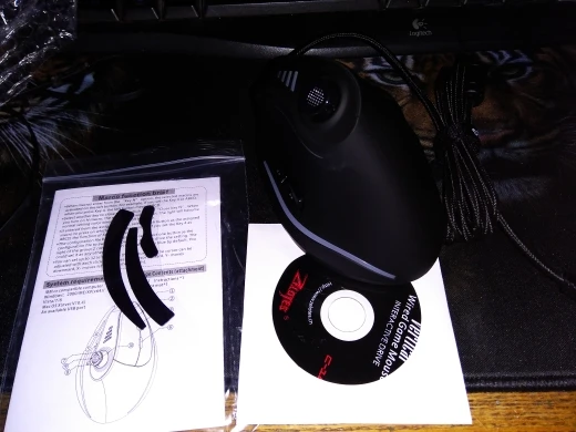 Мышка супер, а вот транспортная компания отстой полный. В комплекте диск (куда его сейчас вставлять то..?), Запасные скользящие самоклеющиеся полоски на дно мышки, кабель в тканевой оплетке, перед штекером usb кольцо шумодава от помех. Кнопки работают мягко, но чётко, джойстик то же... В работе не пробовали...