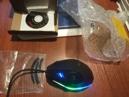 Посылку получил через неделю (НН, Россия) - принёс курьер из IML. Трек отслеживался. Мышь старательно упакована в пупырку, но всё равно коробку слегка помяли. В комплекте CD, инструкция и запасные ножки для скольжения по коврику. В целом всё как в описании, мышь уверенно лежит в руке, покрытие приятное на ощупь. Новую программу и драйверы скачал с официального сайта. Подсветку выключил, чтобы по ночам не мешала.