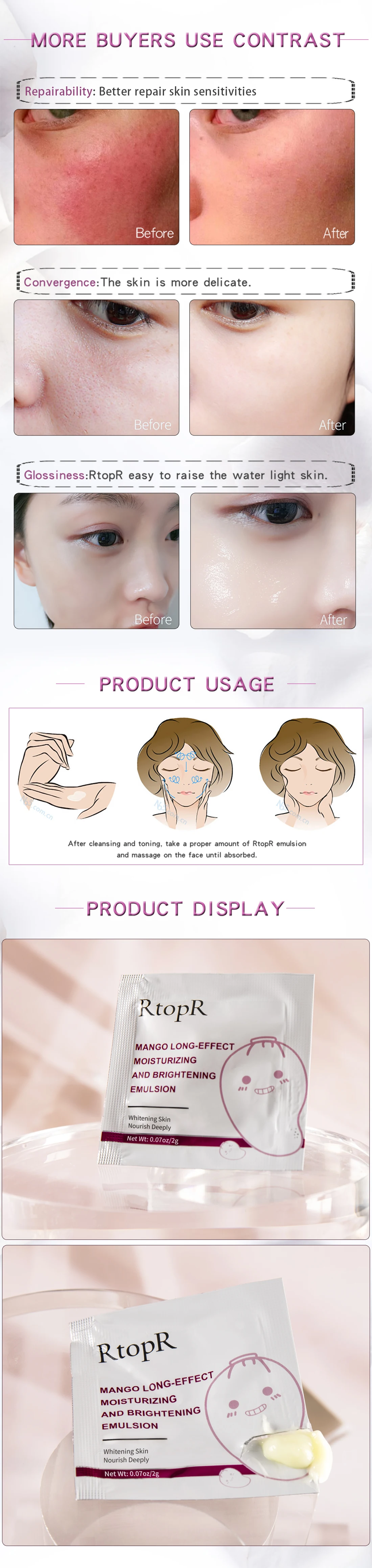 1. После очищения и тонирования,2. Возьмите соответствующее количество этого продукта на лицевой стороне.3. Мягко массируйте, чтобы впитать.