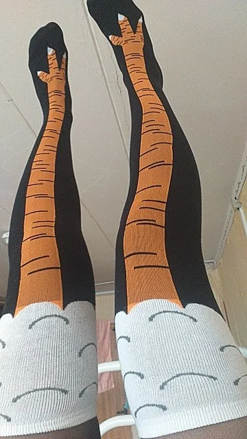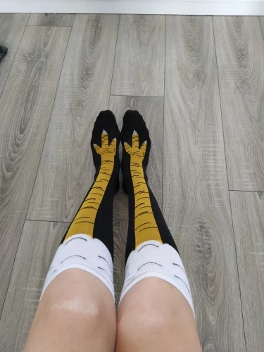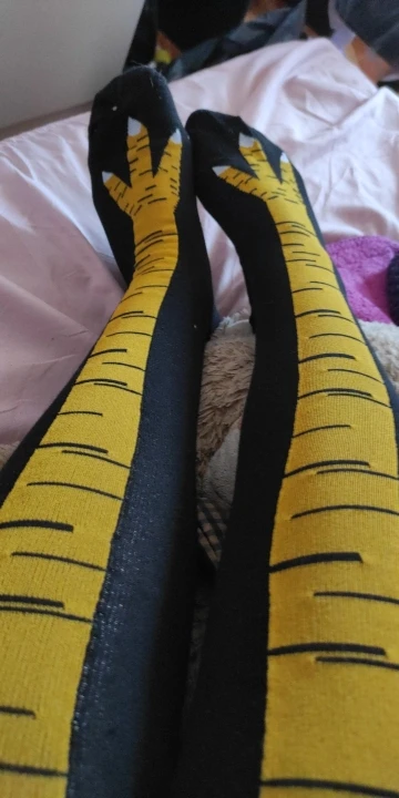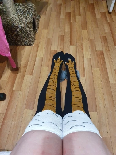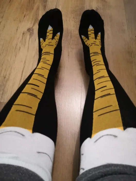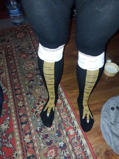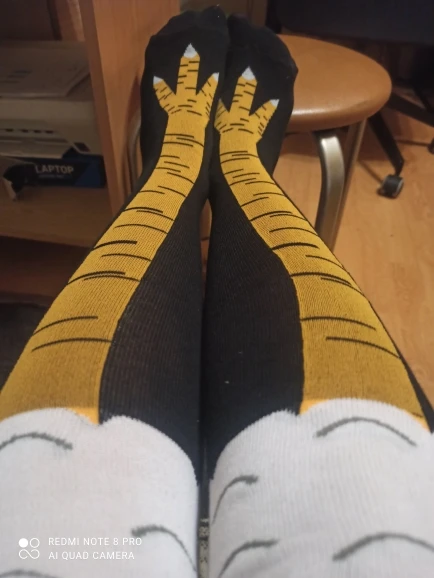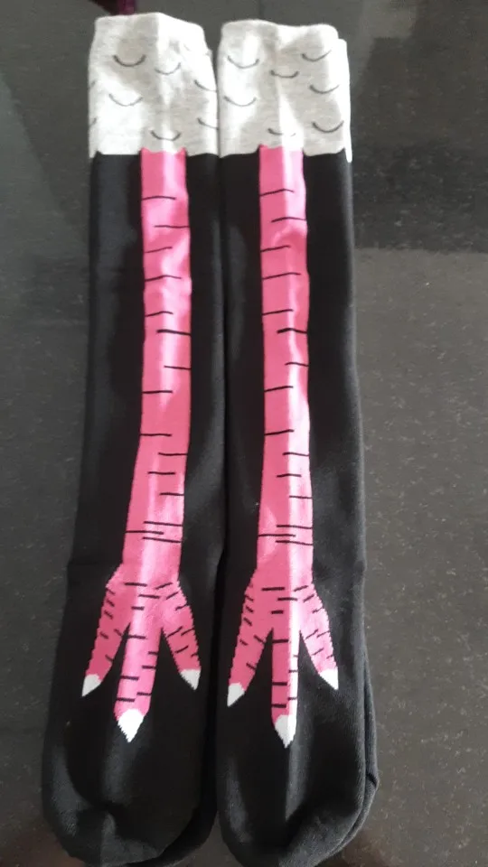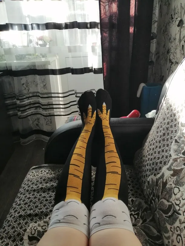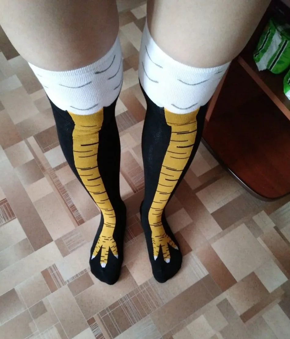 Носки отлично выглядят забавно, но я получил самый большой, и они все еще сдавливают худые ноги моих друзей. Мило и забавно-точно так же, как на фото, просто постирайте их наизнанку, чтобы снизить возможный зуд, а затем хорошо отправляйтесь. Милые носки с курицей! Они приносят хороший смех!