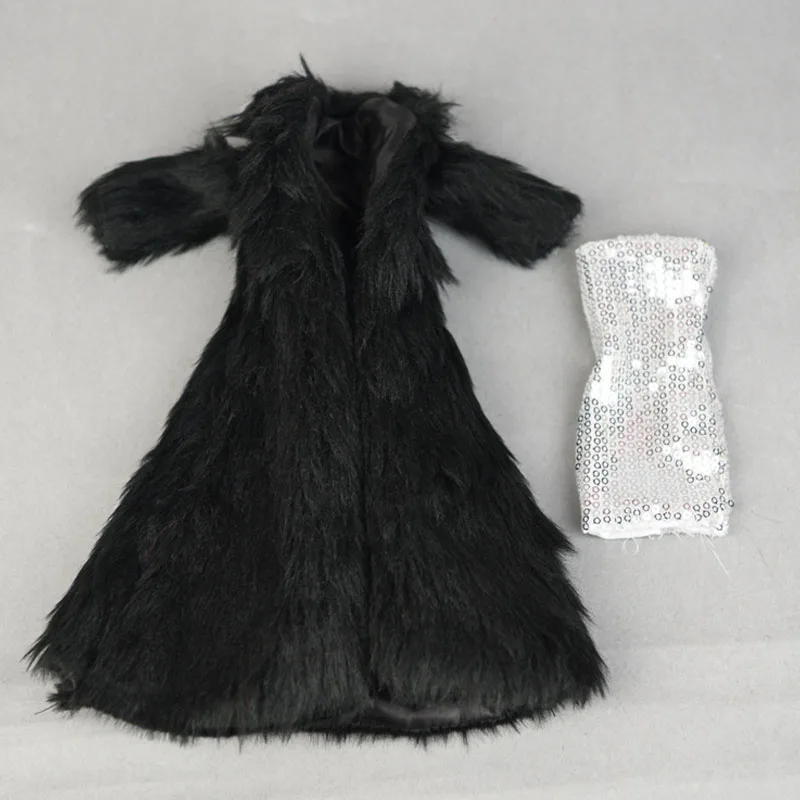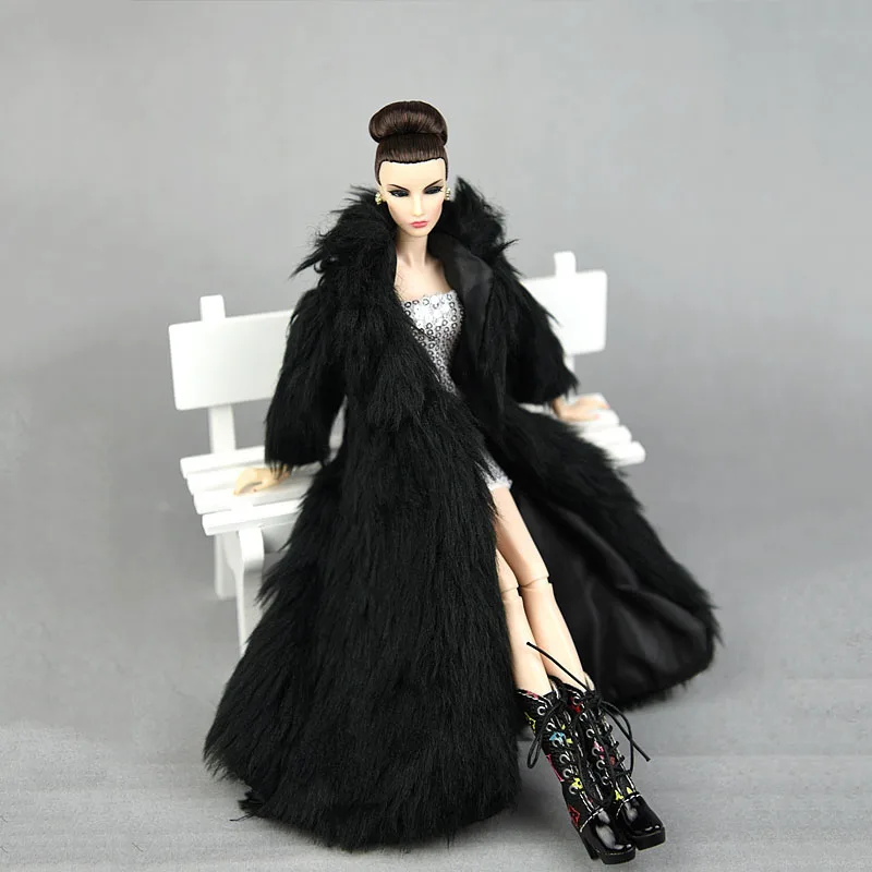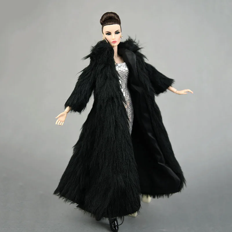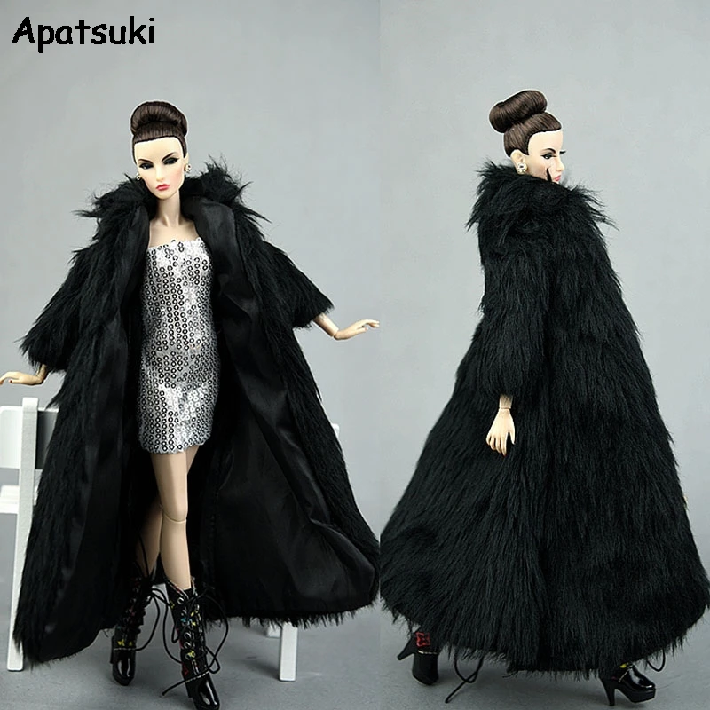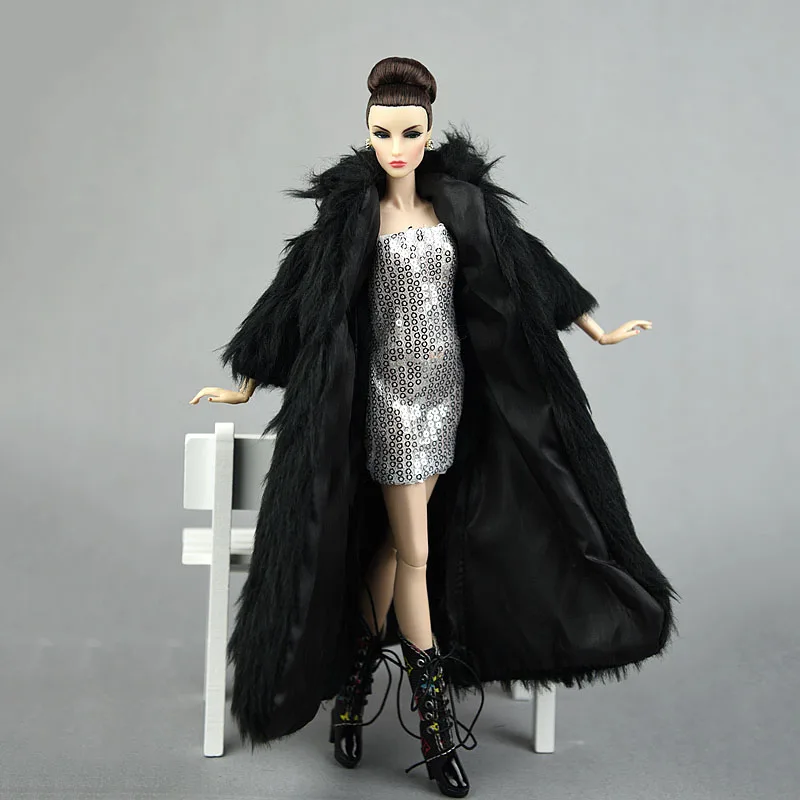 Комплект зимний супердлинный меховое черное пальто и серебристое платье для куклы Барби модная одежда парка платье наряд для куклы 16 аксессуары
