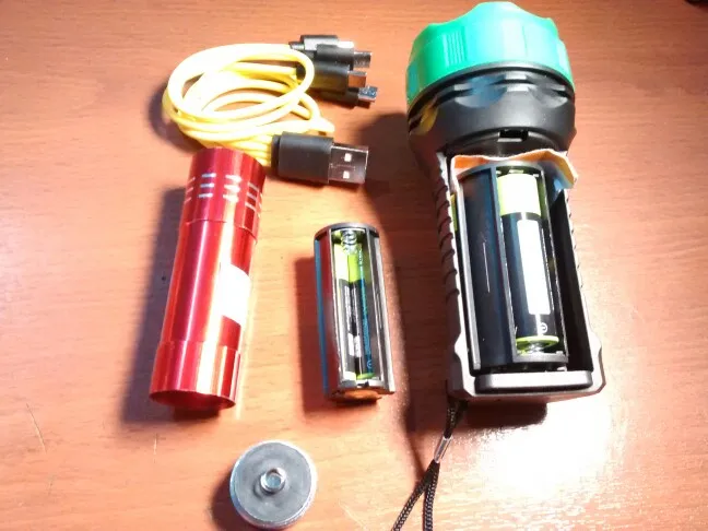 Был подарок в виде фонарика, два акума плюс провод на зарядку от usb, заряжаются