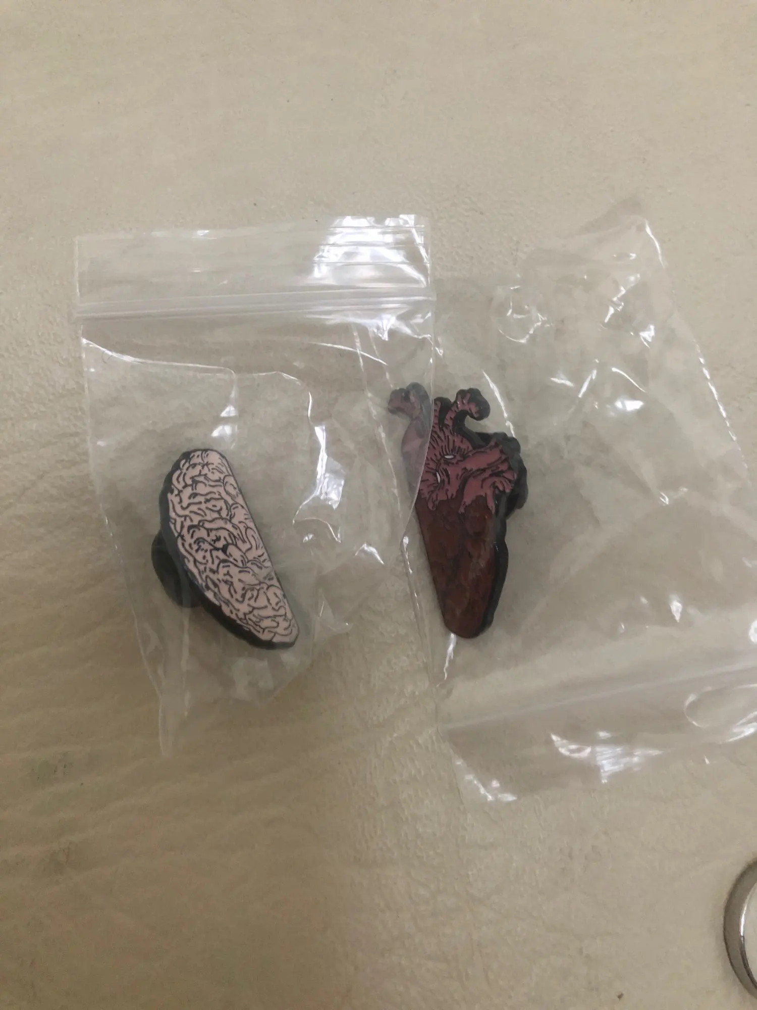 Доставка около двух недель, мозг и сердце - это два отдельных значка, которые можно носить вместе. Всем довольна.)