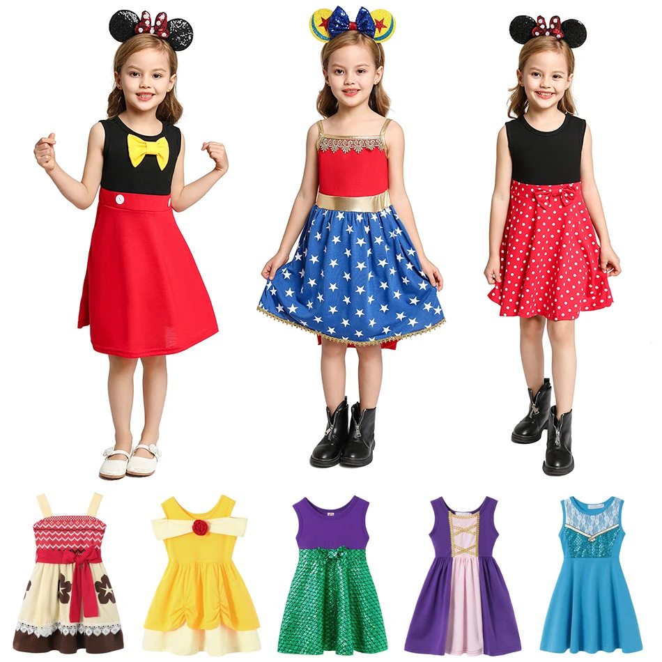 Платье для девочек с маленькой русалочкой, Микки, Минни, Снежная королева, Эльза, Анна, Белоснежка, Моана, Елена, нарядное Повседневное платье принцессы для вечеринки