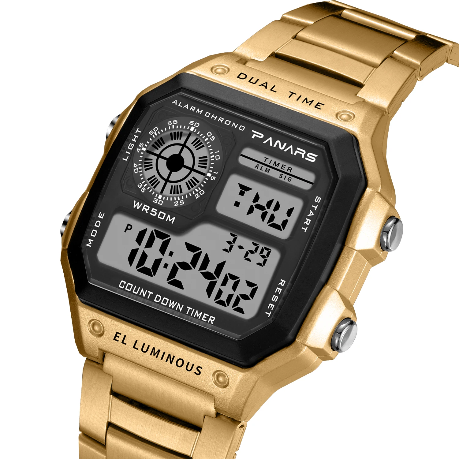 Часы PANARS Мужские Цифровые, спортивные водонепроницаемые из нержавеющей стали, с хронографом, светодиодный ем, 5 бар