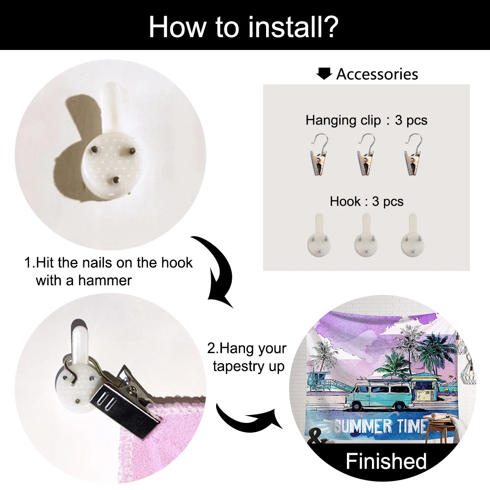 Посылка включает в себя:1 гобелен + 3 гвозди + 3 крючка