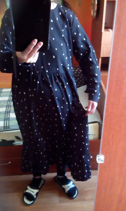 Платье неоднозначное. Принт симпатичный, ткань синтетика, швы ровные, всё ок, кроме одного. Оно блять гигантское. Не оверсайз, а охуёверсайз. Мой размер S, это же платье и для L и, думаю, для XL подойдёт, я хз, оно правда огромное. С ремнем можно, можно сверху кофту, чтобы не было видно, что оно очень велико. А так хорошо, симпатично. Рукава как раз (мой рост 168). Единственное, лучше пришить дополнительные пуговицы на рукава, а то широки немного.