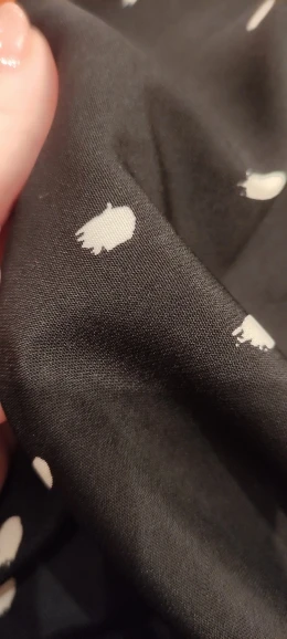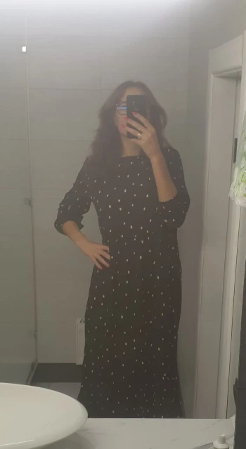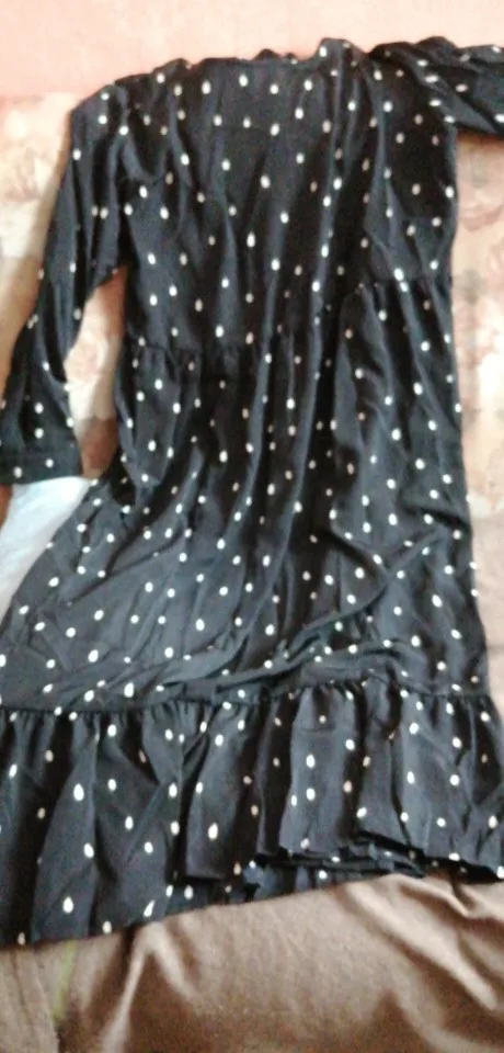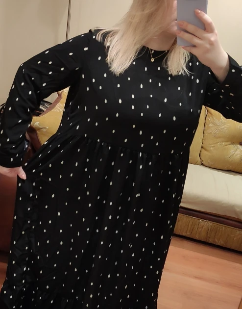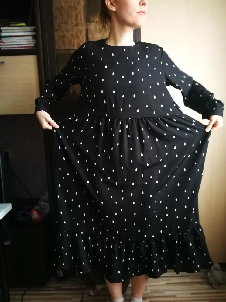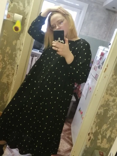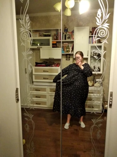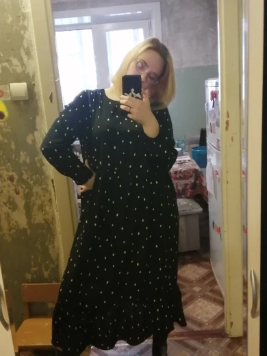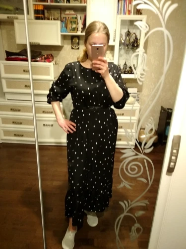 У меня смешанные чувства от этого платья. Размер L на бюст 100 сидит очень свободно, далее плечи великоваты несколько. Талия завышенная, а без пояса на мне оно как мешок с картошкой. А пояс не надеть из-за завышенной талии. Попробую купить широченный пояс, чтобы перекрыть шов, который не на месте. Расцветка на фото выглядит лучше, в жизни это размазанные, не круглые пятнышки, слегка кремовые, на черном фоне. Наверное, платье гораздо лучше сядет на фигуру с маленьким бюстом, а ночь его тогда лучше без пояса. В общем, если вам не идет завышенная талия, лучше не брать.