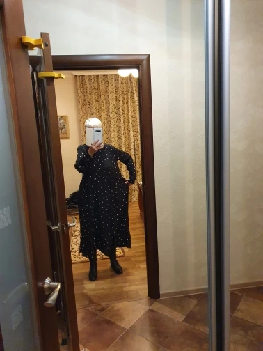 Платье хорошее мне понравилось, но не соответствует размерам. Очень большое, мой размер 52 + я в положении на 7 месяце. И всё равно я в ней утонула)) пойду ушивать по краям. А так качество мне понравилось, на осень самое то)