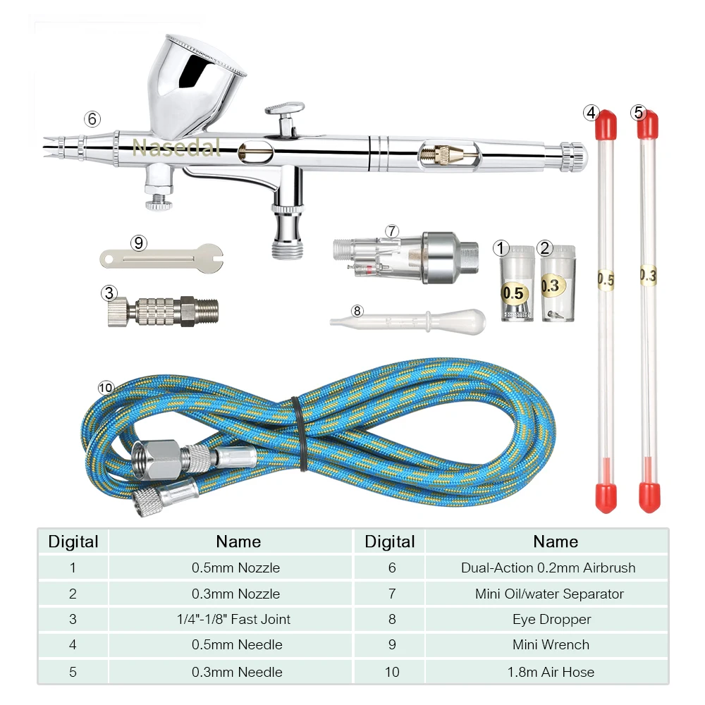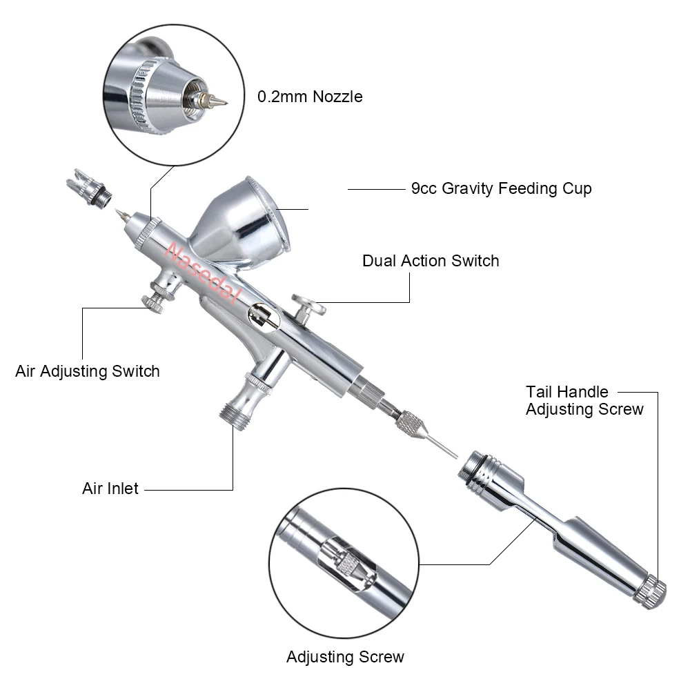 Мини-Аэрограф Nasedal двойного действия, 9cc, 0,2 мм, распылитель краски для дизайна ногтей, инструмент для макияжа, украшение торта, аэрограф, режим татуировки, краска