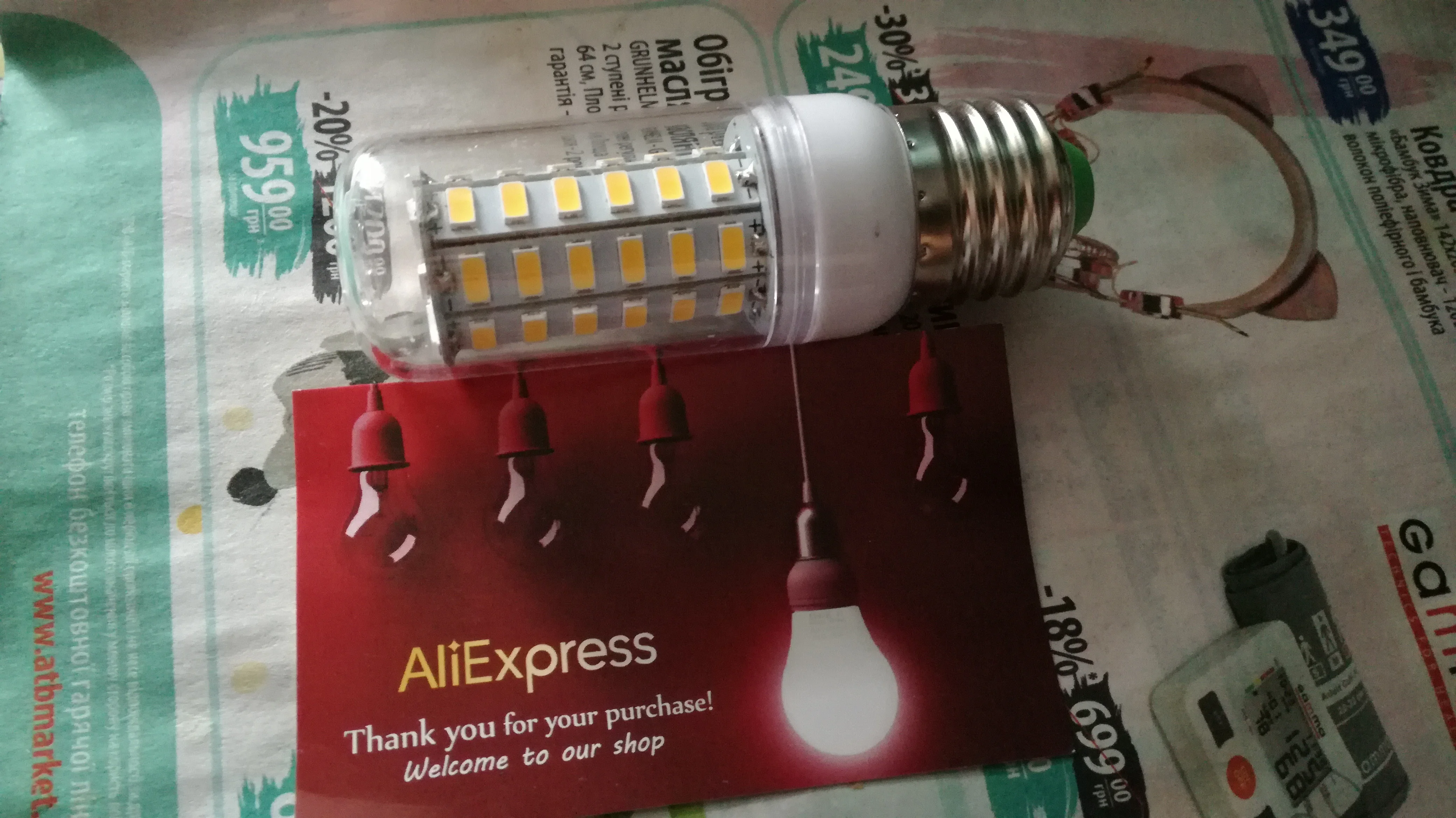 Заказал из любопытства. Доставлена в Подмосковье за месяц. Светит слабовато, через камеру телефона видно очень сильное мерцание, что соответственно отразилось на фото. На мой взгляд сгодится для подъезда или сарая, но никак не для жилых помещений.