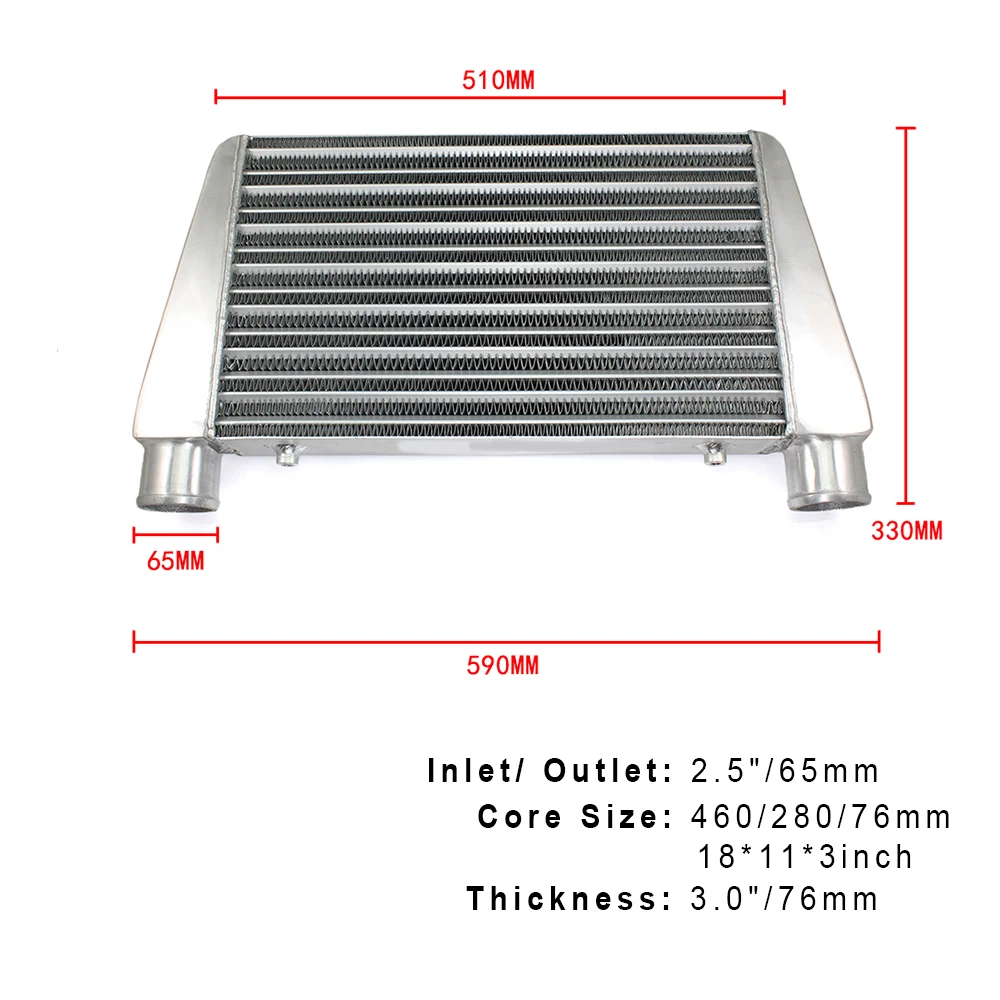 Общий размер интеркулера: 590 мм (Д) X 330 мм (В) X 76 мм (Ш) Размер ядра: 460 мм (Д) X 280 мм (В) X 76 мм (Ш) Вход/выход: 2,5 дюймов/65 мм Настоятельно рекомендуется Профессиональный установщик (в комплект не входит инструкция).