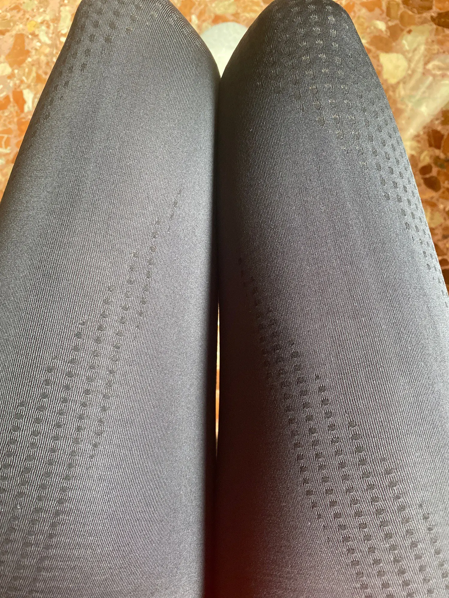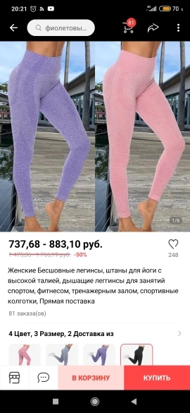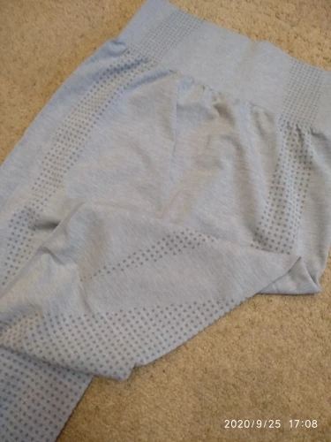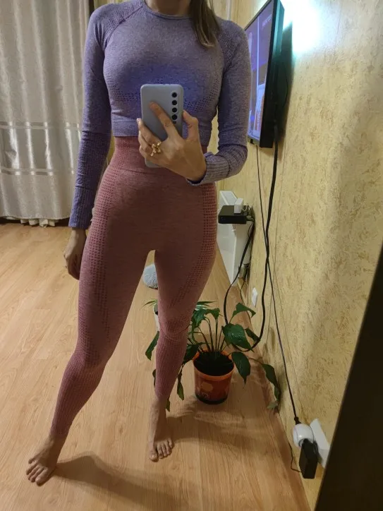 Заказывала точно такую же модель у другого продавца, и она была шикарной - идеальная ткань, не толстые, не жаркие. У этого продавца совсем не то - леггинсы очень плотные, в них реально очень жарко заниматься, колются, сзади на попе странная полоса, (может это затяжка, или была изначально - не знаю), но когда надеваешь леггинсы, она растягивается и становится прозрачной, сами леггинсы просвечивают при приседе на 100%. Не рекомендую