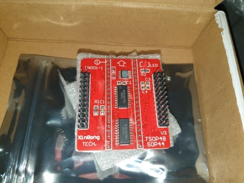 Шло долго, взял только красный переходник с тремя микросхемами. Панелька была на зеленой плате(nand). 29lv160d считало. Упаковано хорошо.
