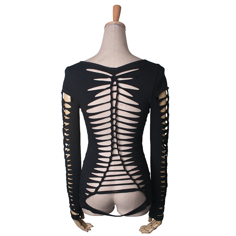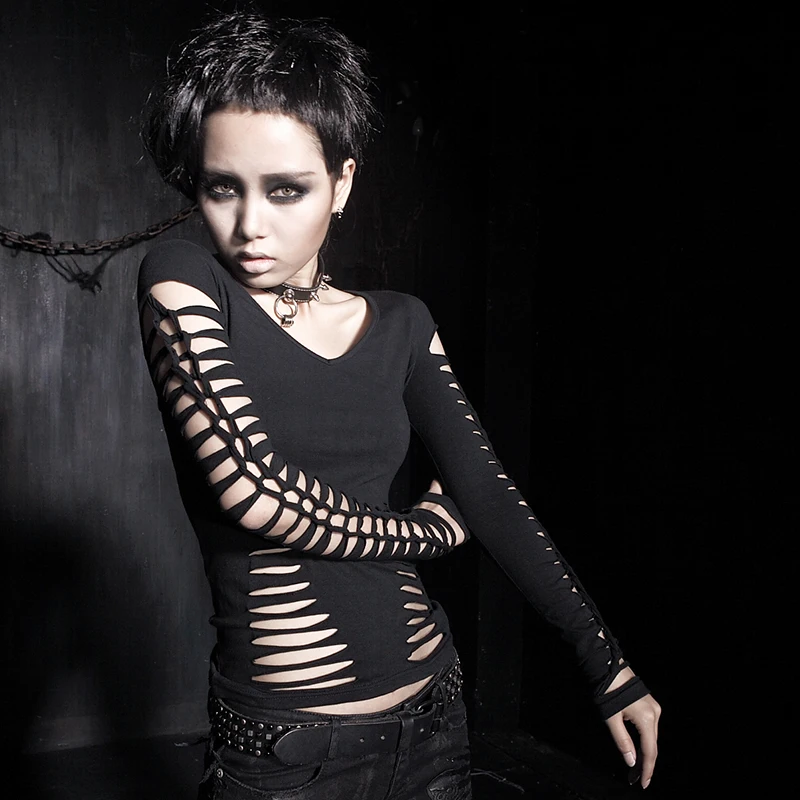 Женский топ в стиле панк-рейв, черные топы с вырезами и длинным рукавом в стиле панк, готический стиль, хип-хоп, Сексуальная футболка
