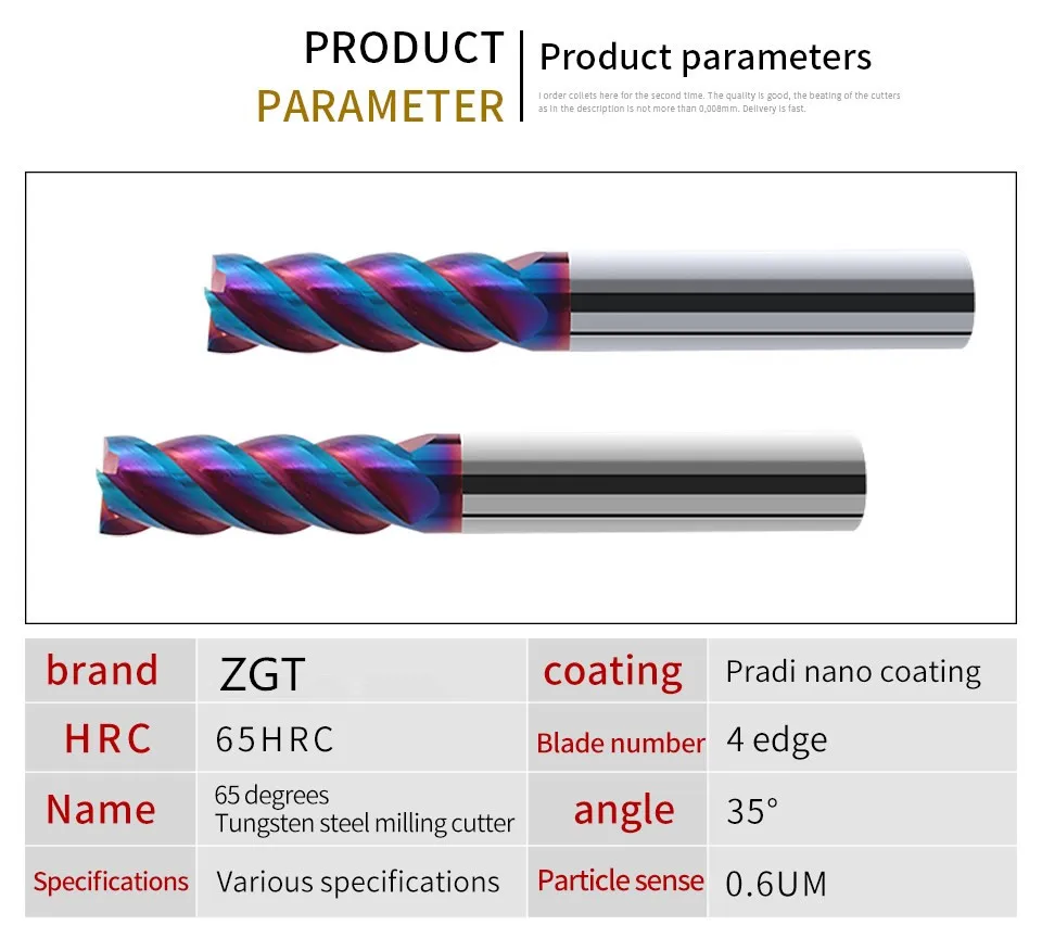 Фреза ZGT HRC65, 4 канавки, сплав карбида, фреза из вольфрамовой стали, Концевая фреза, металлическая фреза 4 мм 6 мм 8 мм 10 мм 12 мм