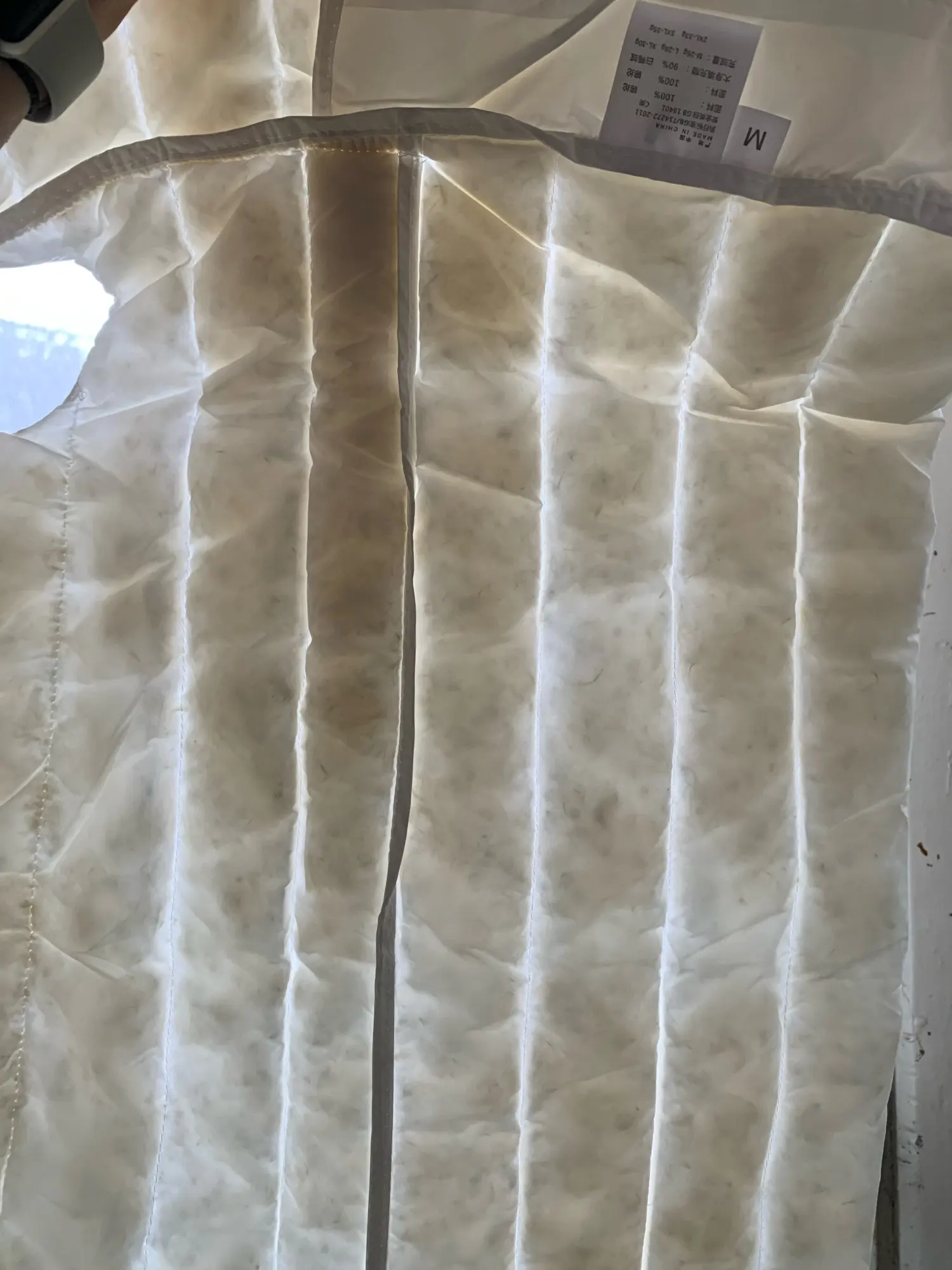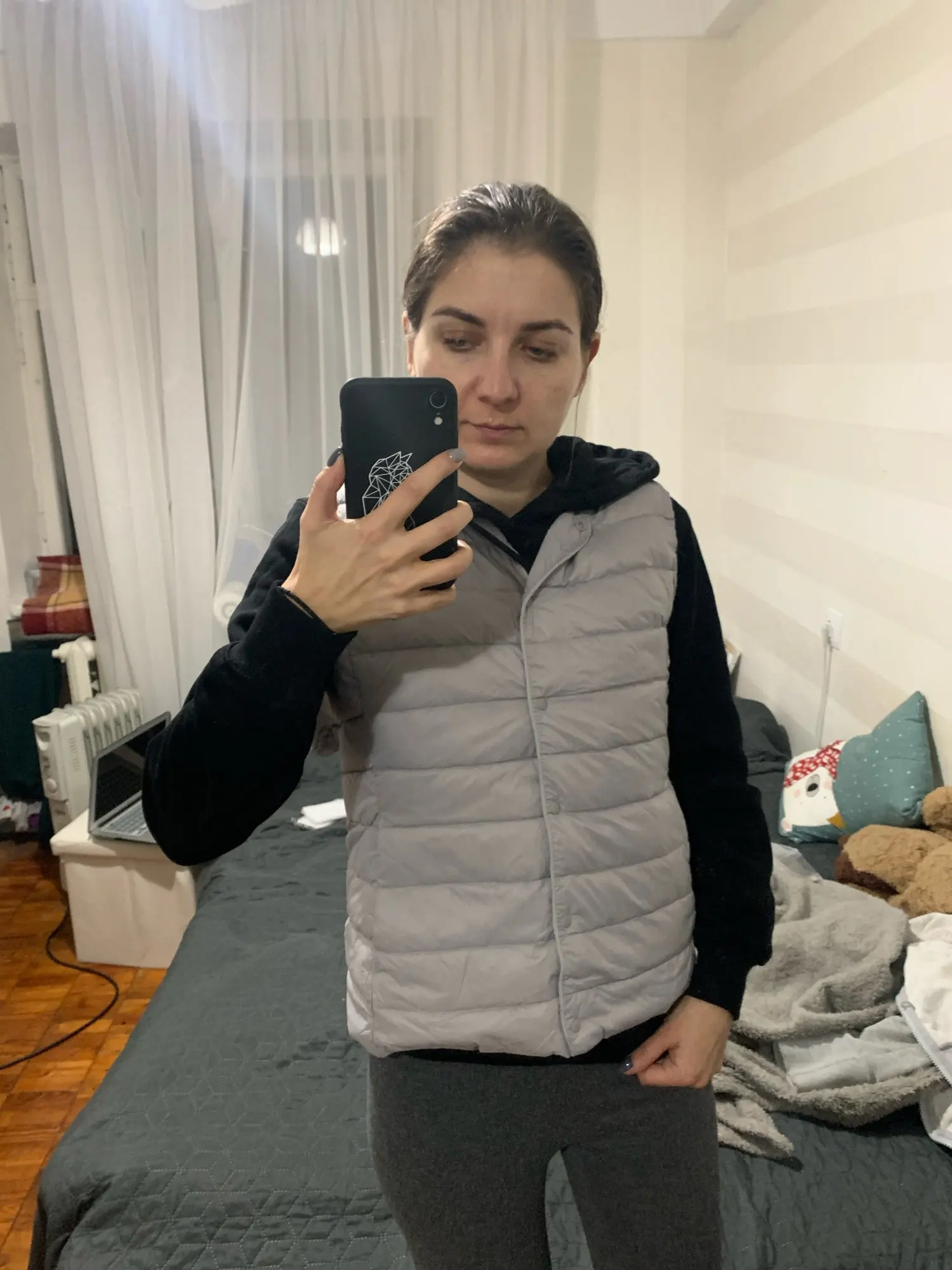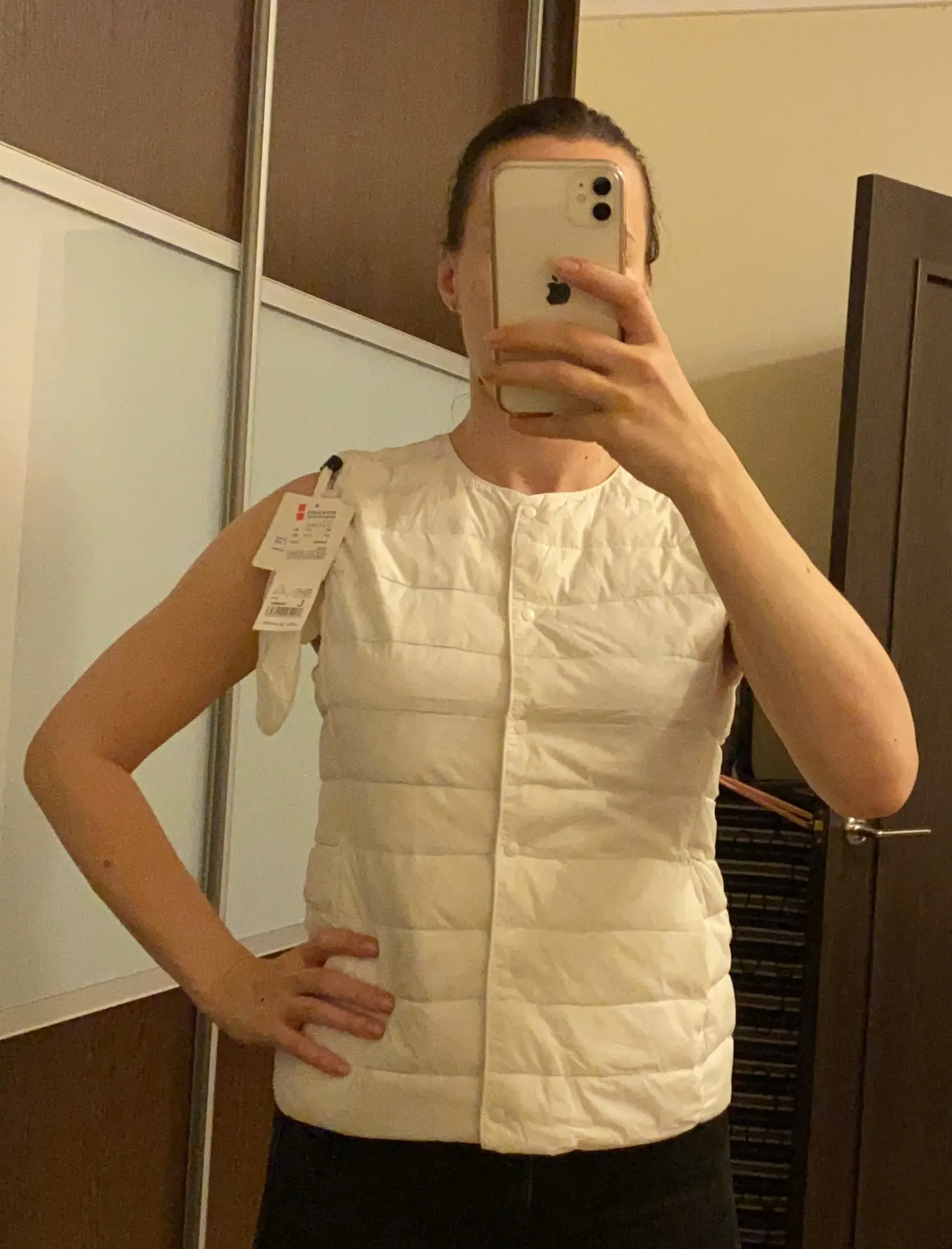 Жилет хороший за свою цену. Сравнивала со своей курткой из Юникло, разницы не заметила. Ношу размер М, жилет сел плотненько, особенно в груди. Можно было бы взять на размер побольше, тк на худи или свитер чуть толстый не подойдет. В целом довольна, серый цвет приятный, нитки нигде не торчали.