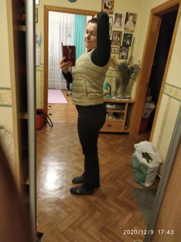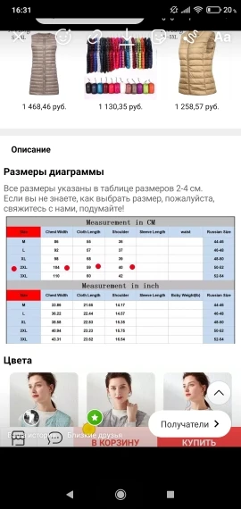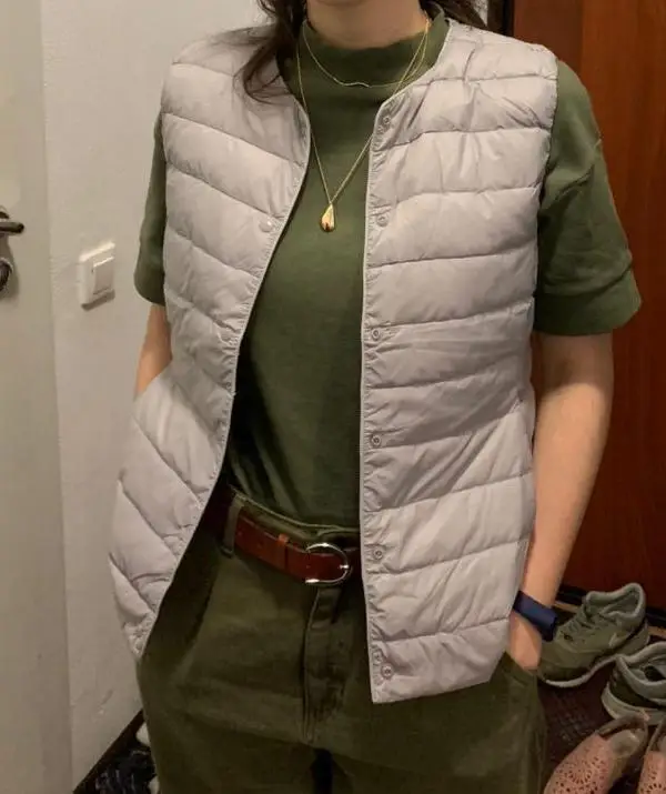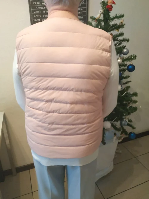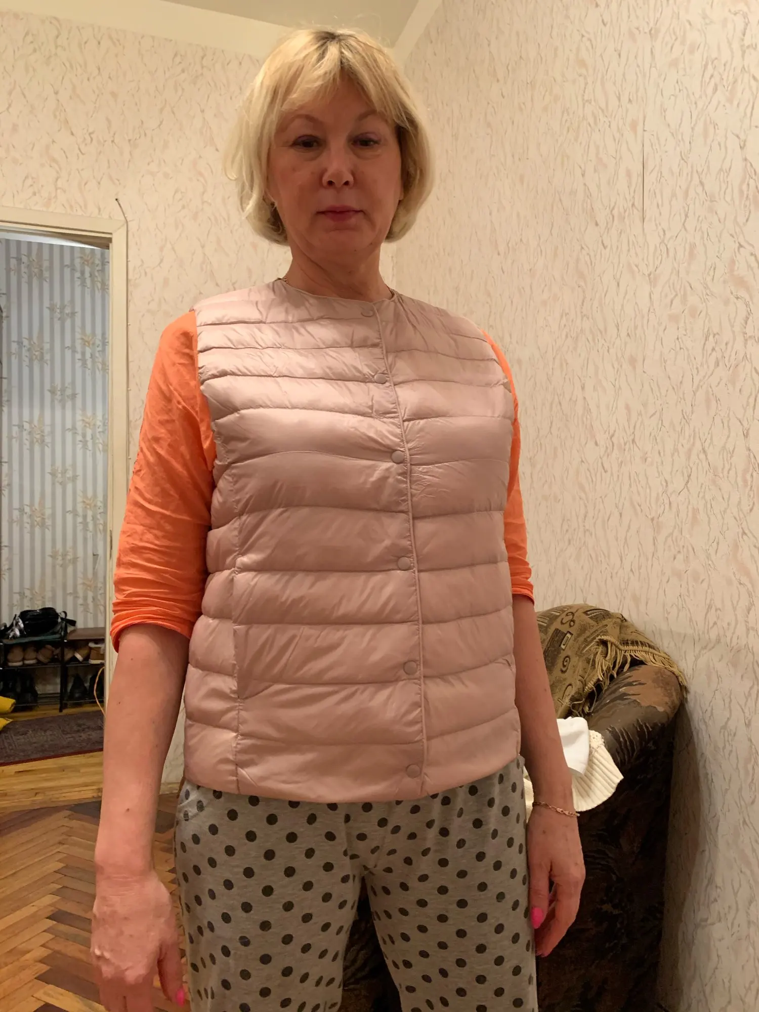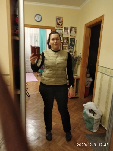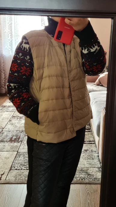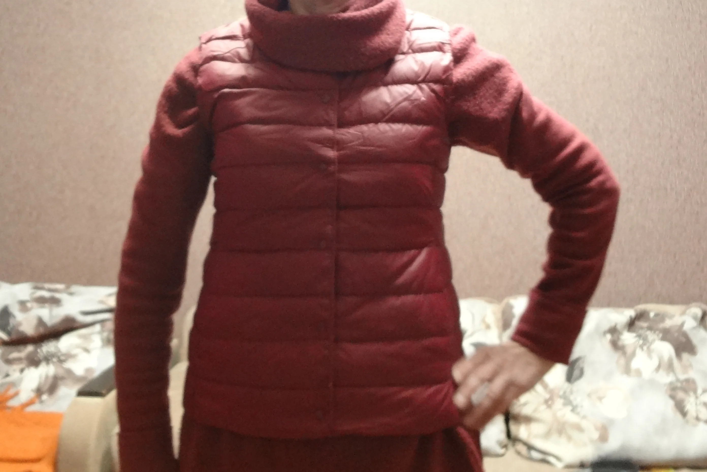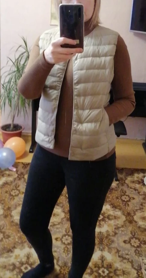 Жилет невесомый, тоненький, но греет. Удобно одевать под пальто и др одежду. Маломерит. На рр российский 44 взяла L, по плечам хорошо, а в груди стянуло, кнопку растёгиваю.