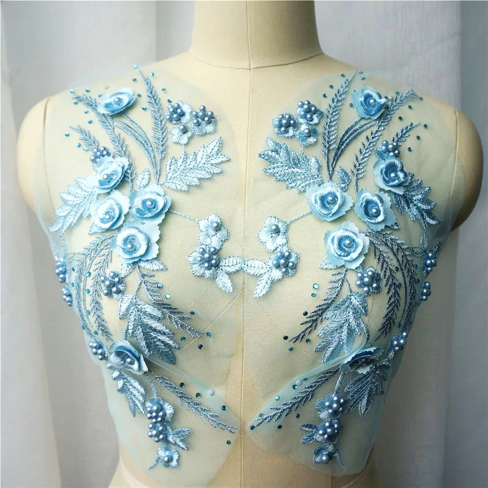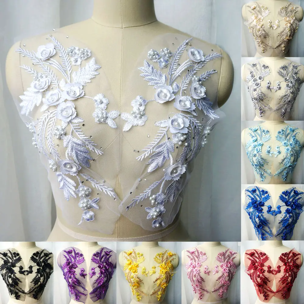 Кружевная ткань, вышитая бисером, с 3D цветами, 2 шт., свадебное платье аппликация