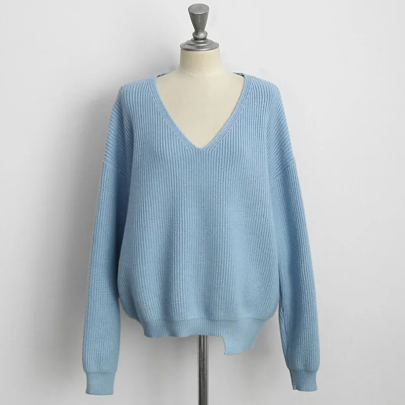 Женский свитер с v-образным вырезом в Корейском стиле; сезон осень-зима; Повседневный Женский обтягивающий пуловер с длинным рукавом и асимметричным подолом