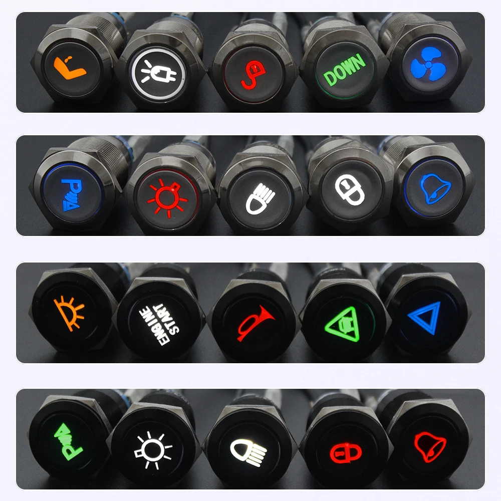 Настраиваемые символы 19 мм, металлооксид, черноеЛатунное покрытие, кнопочный переключатель, лампа, светодиодный плоский с фиксациеймгновенным вентилятором светильник для автомобиля