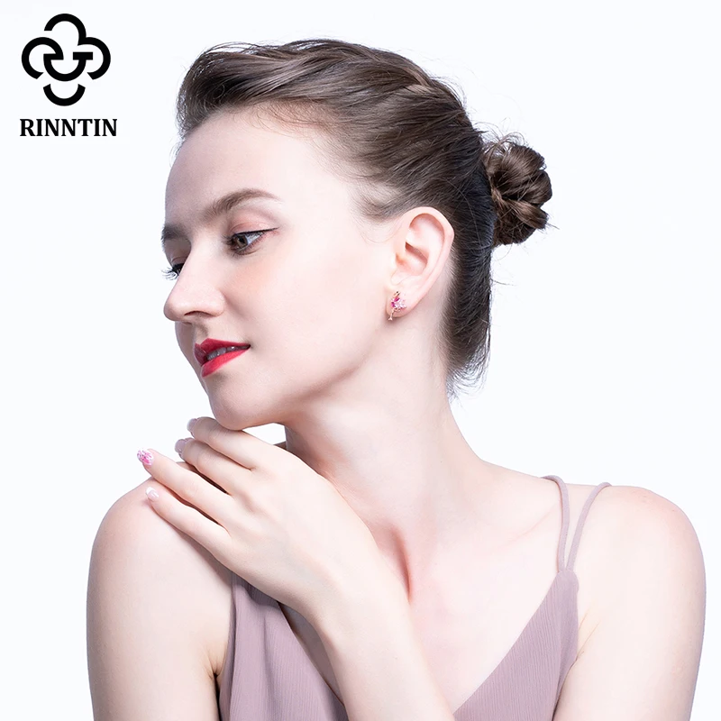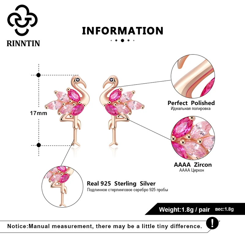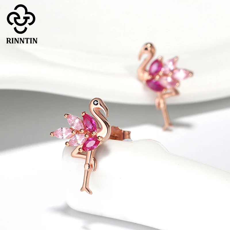 Женские серьги в форме Фламинго Rinntin, из стерлингового серебра 925 пробы, с покрытием из розового золота, милые серьги Птица, серьги-Пусеты Из АААА циркония, украшения TSE164